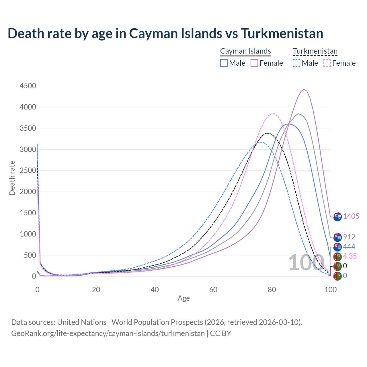 In the Cayman Islands, the most common age of death is 89, compared to 79 in Turkmenistan. The median age of death is 84.9 in the Cayman Islands and 75.1 in Turkmenistan, meaning only half of each cohort is expected to live past that age.