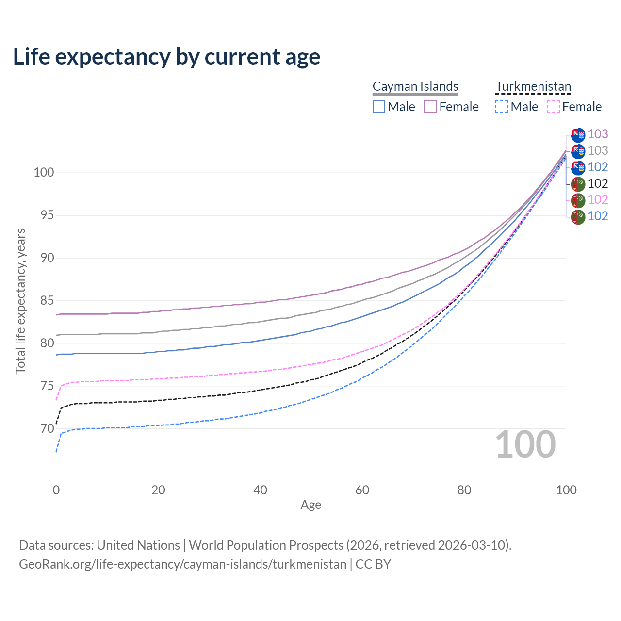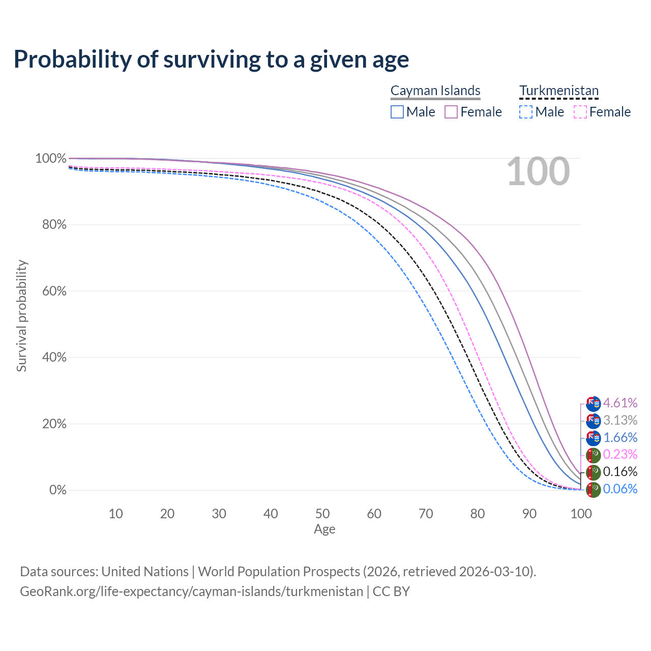This life expectancy calculator shows the odds of living to 100, 95, 90, and below based on current age for both males and females in the Cayman Islands and Turkmenistan, along with mean and median age of death. The calculations are based on the 2026 life tables (actuarial tables) from the UN World Population Prospects.