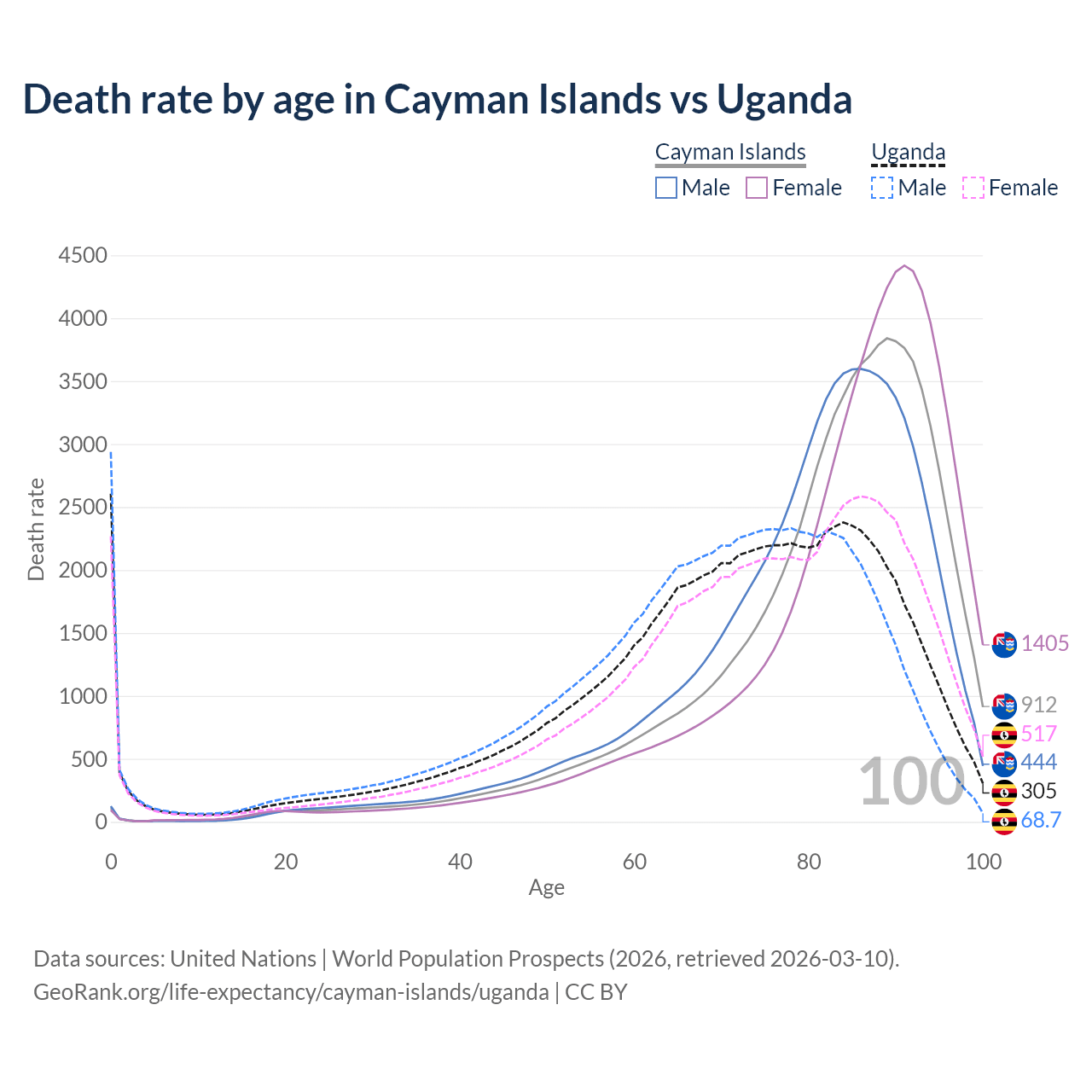 In the Cayman Islands, the most common age of death is 89, compared to 0 in Uganda. The median age of death is 84.9 in the Cayman Islands and 73.3 in Uganda, meaning only half of each cohort is expected to live past that age.