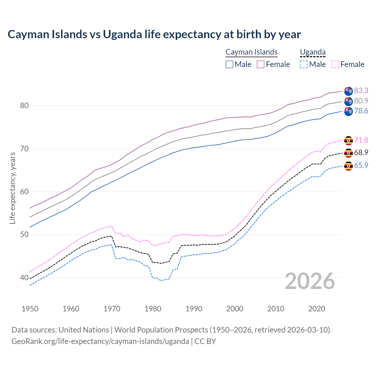 The average life expectancy at birth is 80.9 years in the Cayman Islands vs 68.9 in Uganda. The Cayman Islands is ranked 42/197 by life expectancy, and Uganda is 146/197. In the Cayman Islands, the life expectancy is 78.6 years for males and 83.3 years for females. In Uganda, it's 65.9 years for males and 71.8 years for females.