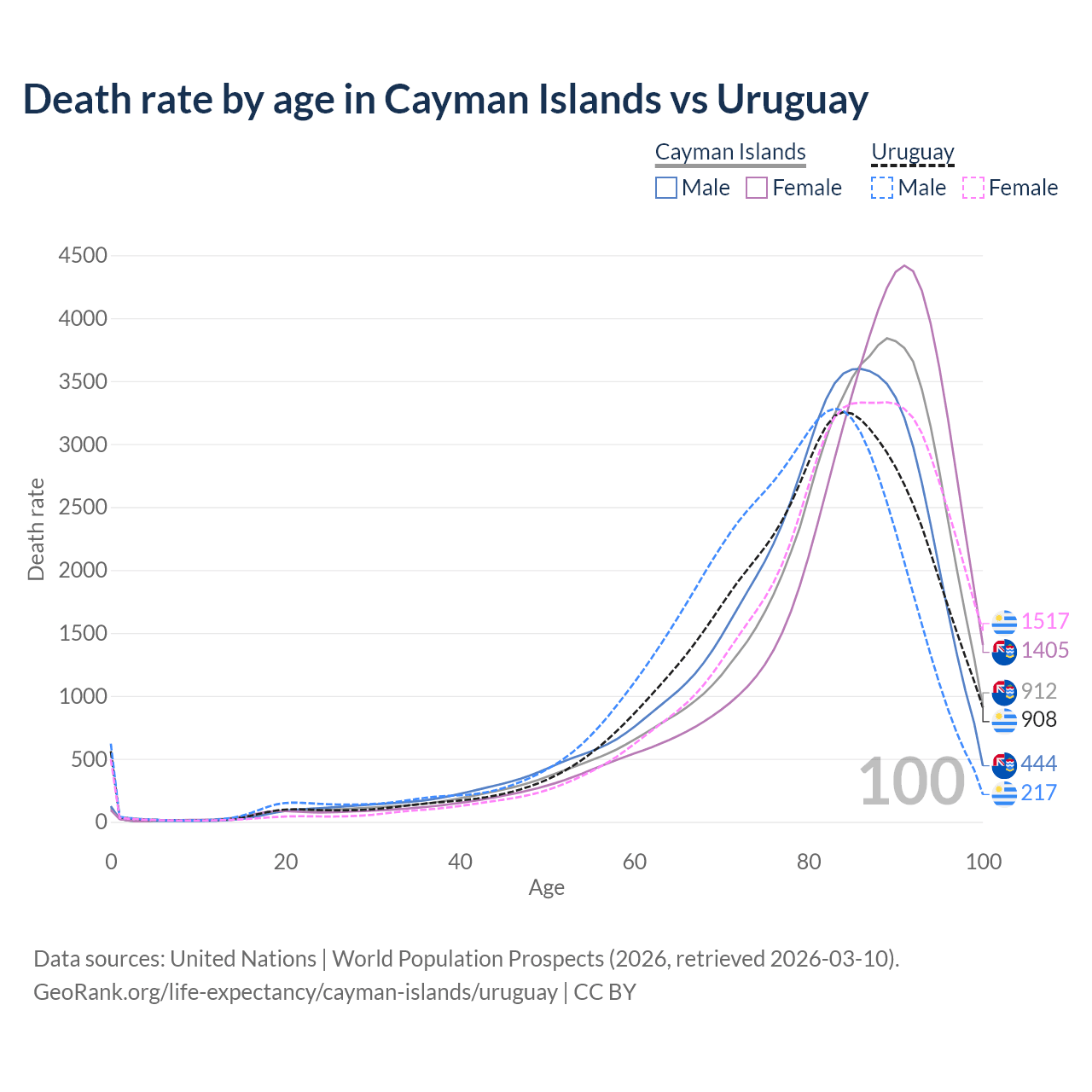 In the Cayman Islands, the most common age of death is 89, compared to 84 in Uruguay. The median age of death is 84.9 in the Cayman Islands and 81.8 in Uruguay, meaning only half of each cohort is expected to live past that age.