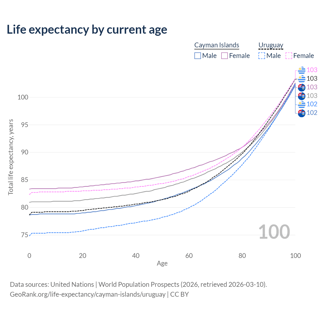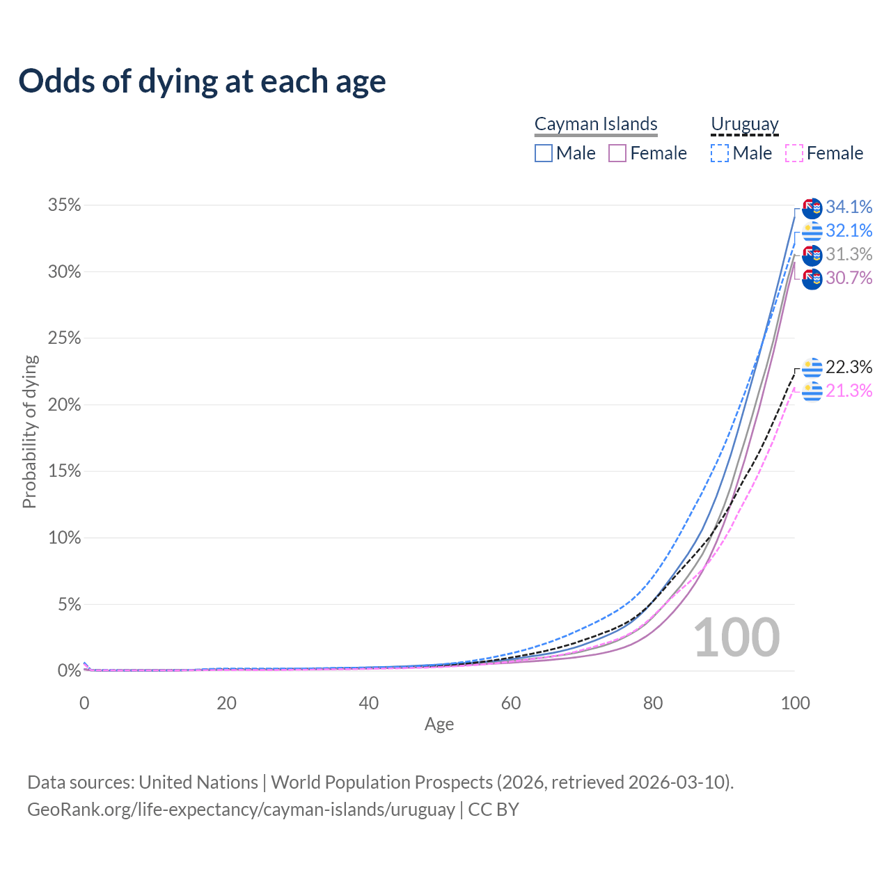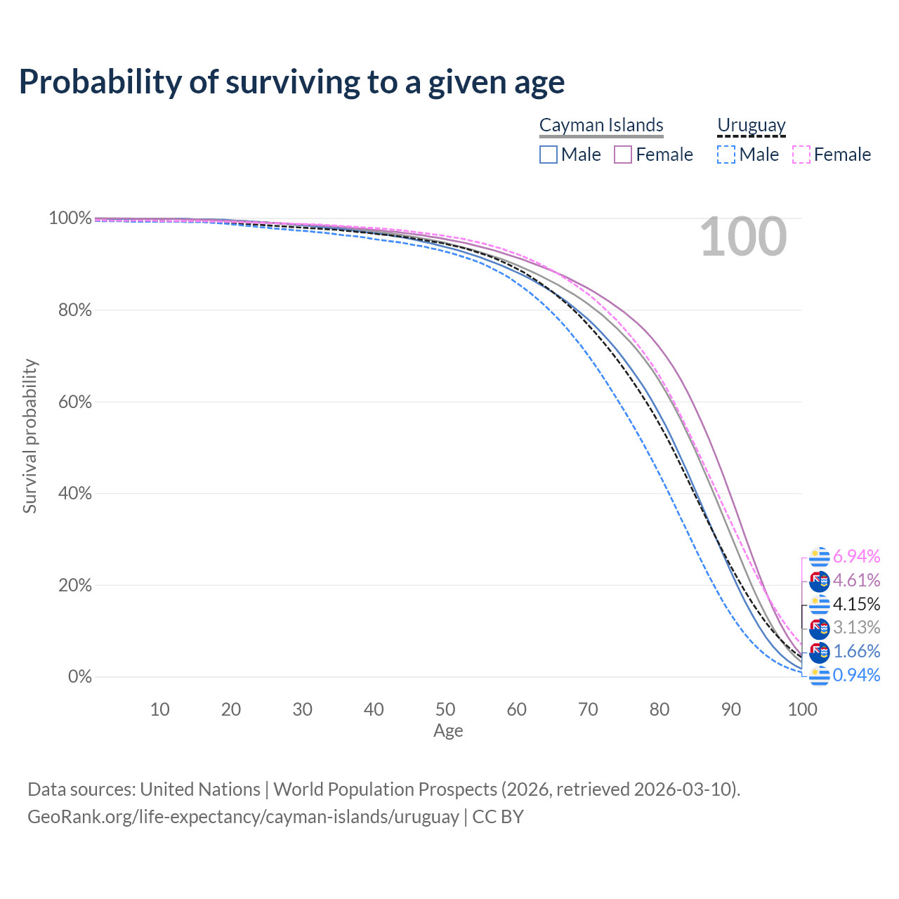 This life expectancy calculator shows the odds of living to 100, 95, 90, and below based on current age for both males and females in the Cayman Islands and Uruguay, along with mean and median age of death. The calculations are based on the 2026 life tables (actuarial tables) from the UN World Population Prospects.