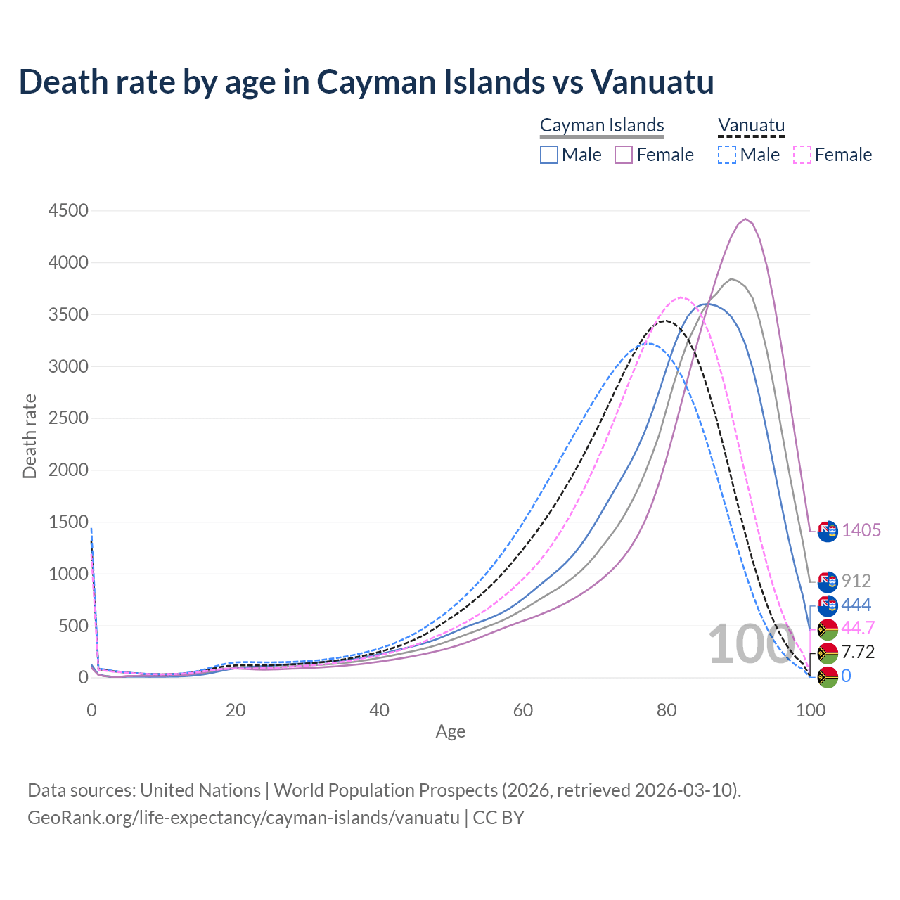 In the Cayman Islands, the most common age of death is 89, compared to 80 in Vanuatu. The median age of death is 84.9 in the Cayman Islands and 75.9 in Vanuatu, meaning only half of each cohort is expected to live past that age.