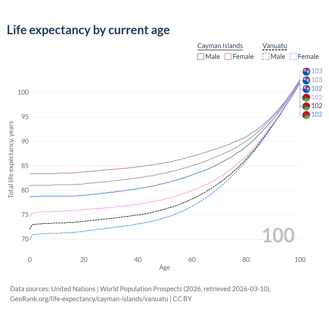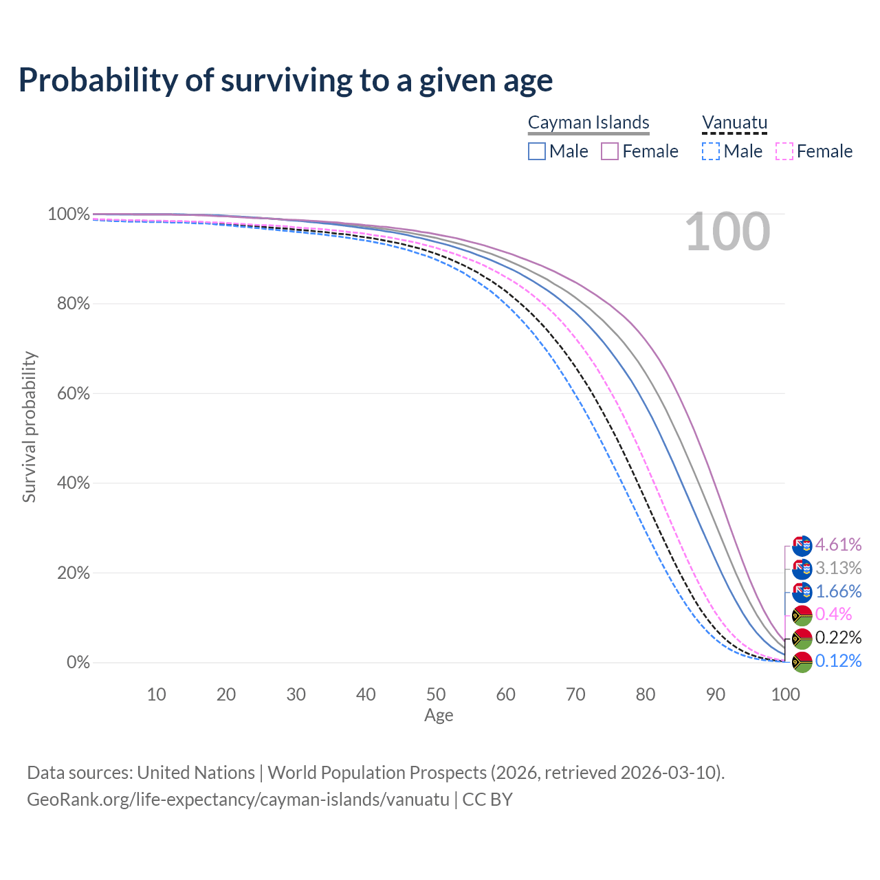 This life expectancy calculator shows the odds of living to 100, 95, 90, and below based on current age for both males and females in the Cayman Islands and Vanuatu, along with mean and median age of death. The calculations are based on the 2026 life tables (actuarial tables) from the UN World Population Prospects.