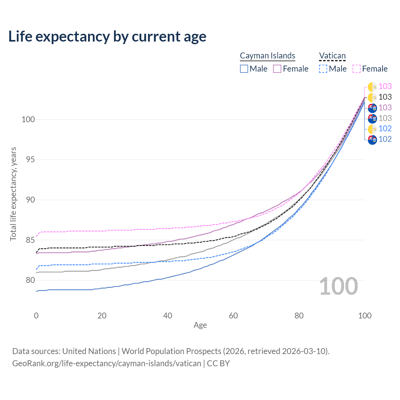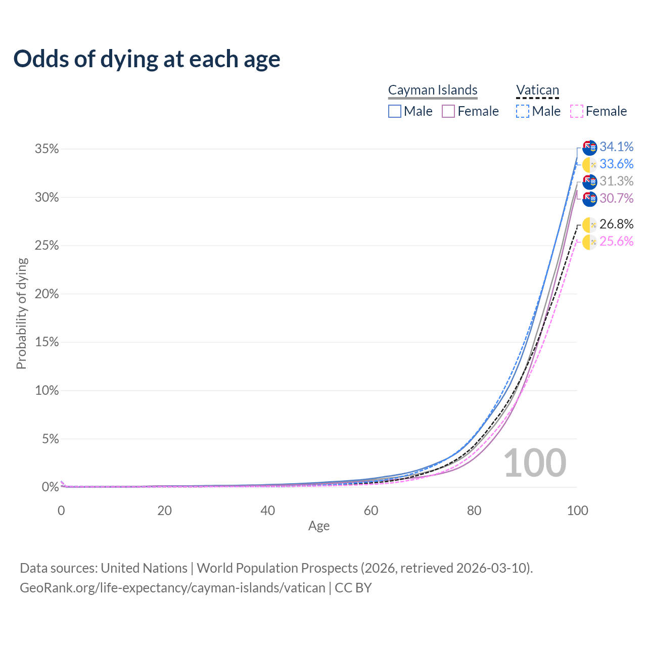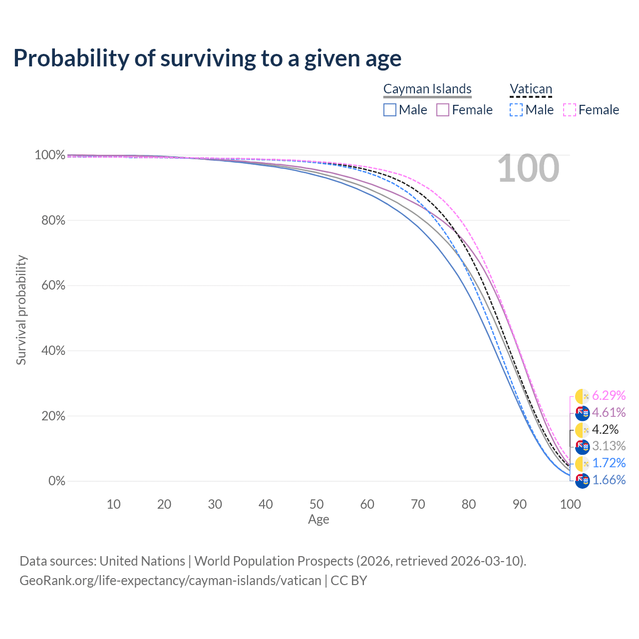 This life expectancy calculator shows the odds of living to 100, 95, 90, and below based on current age for both males and females in the Cayman Islands and the Vatican, along with mean and median age of death. The calculations are based on the 2026 life tables (actuarial tables) from the UN World Population Prospects.