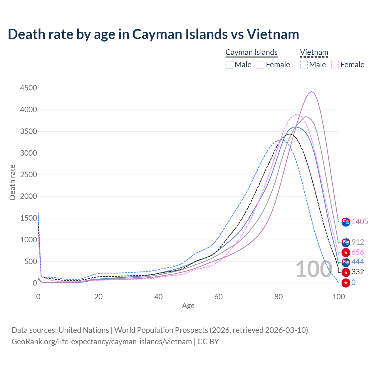 This life expectancy calculator shows the odds of living to 100, 95, 90, and below based on current age for both males and females in the Cayman Islands and Vietnam, along with mean and median age of death. The calculations are based on the 2026 life tables (actuarial tables) from the UN World Population Prospects.