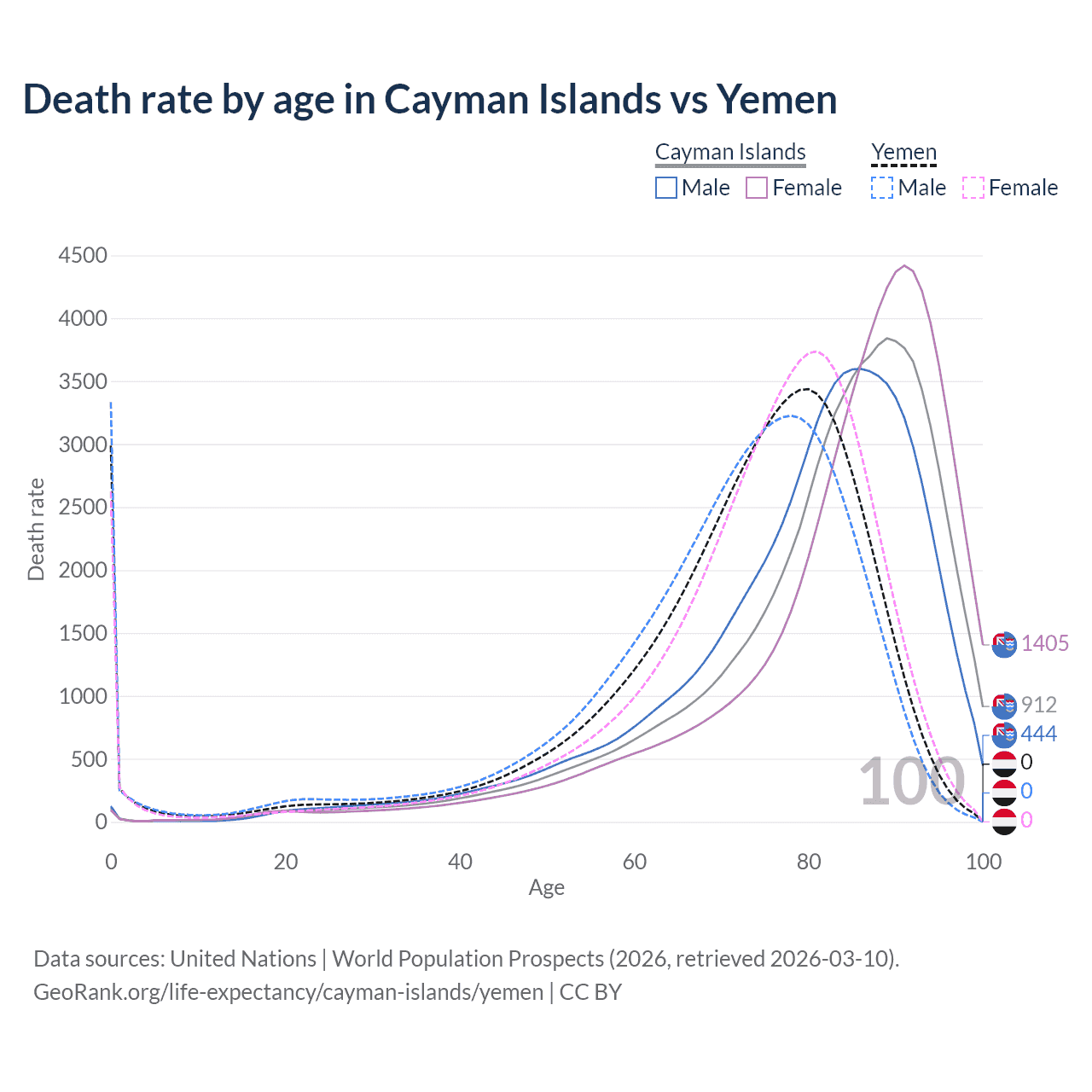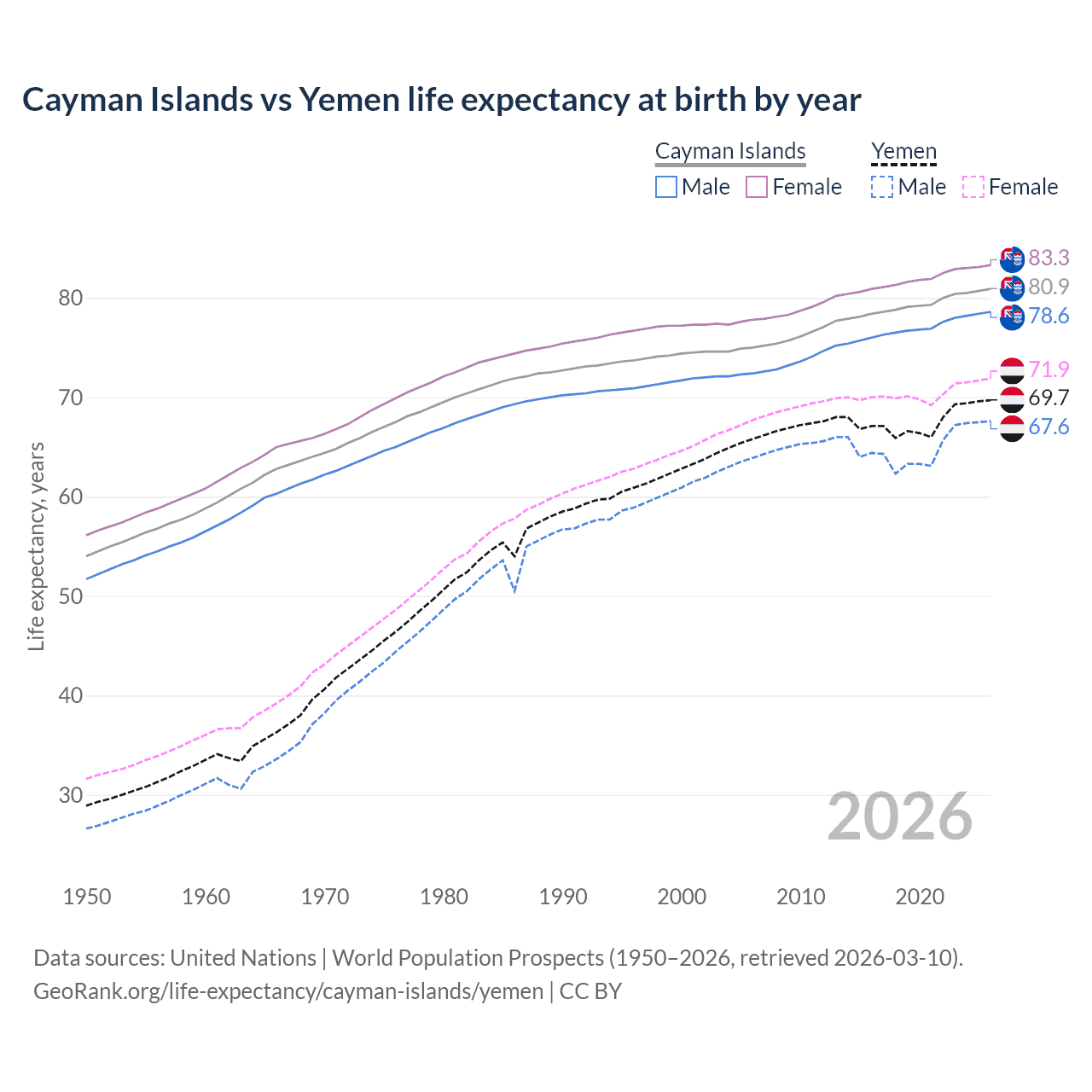 The average life expectancy at birth is 80.9 years in the Cayman Islands vs 69.7 in Yemen. The Cayman Islands is ranked 42/197 by life expectancy, and Yemen is 138/197. In the Cayman Islands, the life expectancy is 78.6 years for males and 83.3 years for females. In Yemen, it's 67.6 years for males and 71.9 years for females.