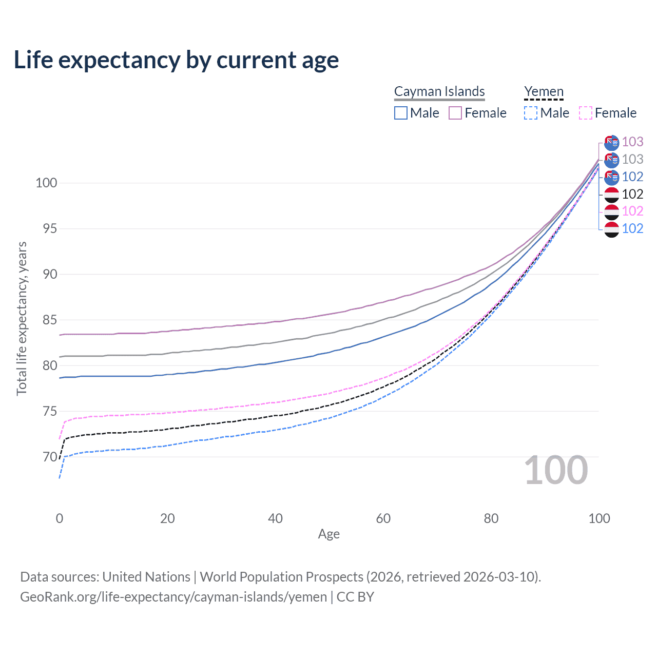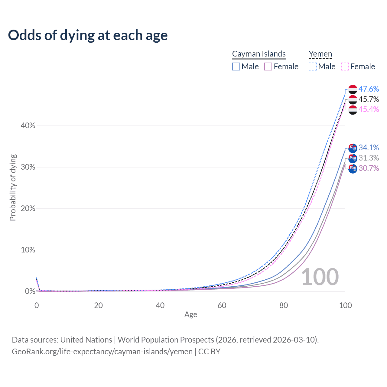 This life expectancy calculator shows the odds of living to 100, 95, 90, and below based on current age for both males and females in the Cayman Islands and Yemen, along with mean and median age of death. The calculations are based on the 2026 life tables (actuarial tables) from the UN World Population Prospects.