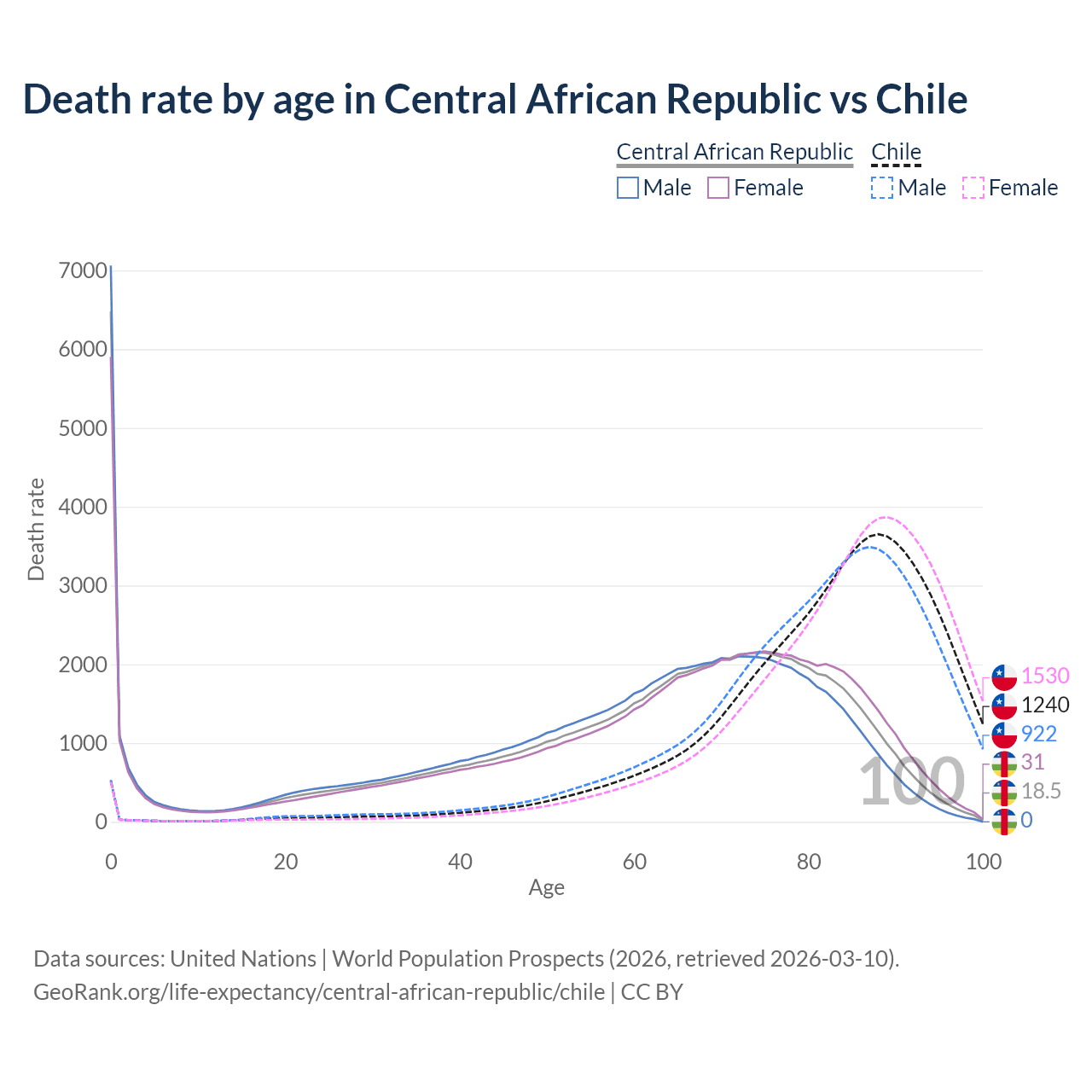 In the Central African Republic, the most common age of death is 0, compared to 88 in Chile. The median age of death is 65.2 in the Central African Republic and 84.8 in Chile, meaning only half of each cohort is expected to live past that age.