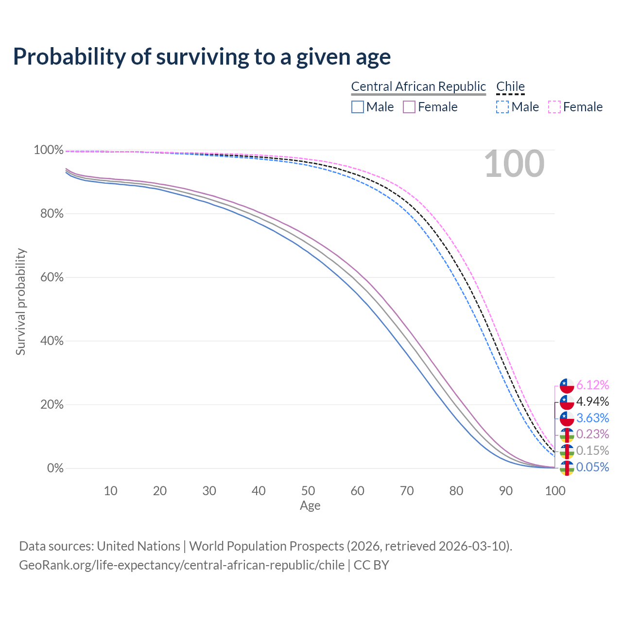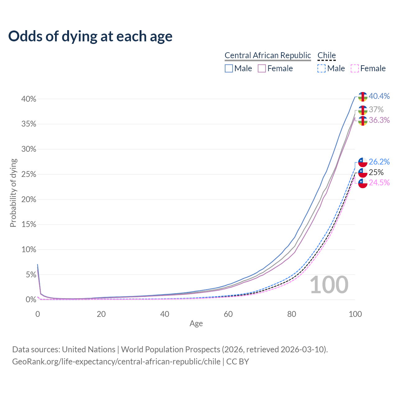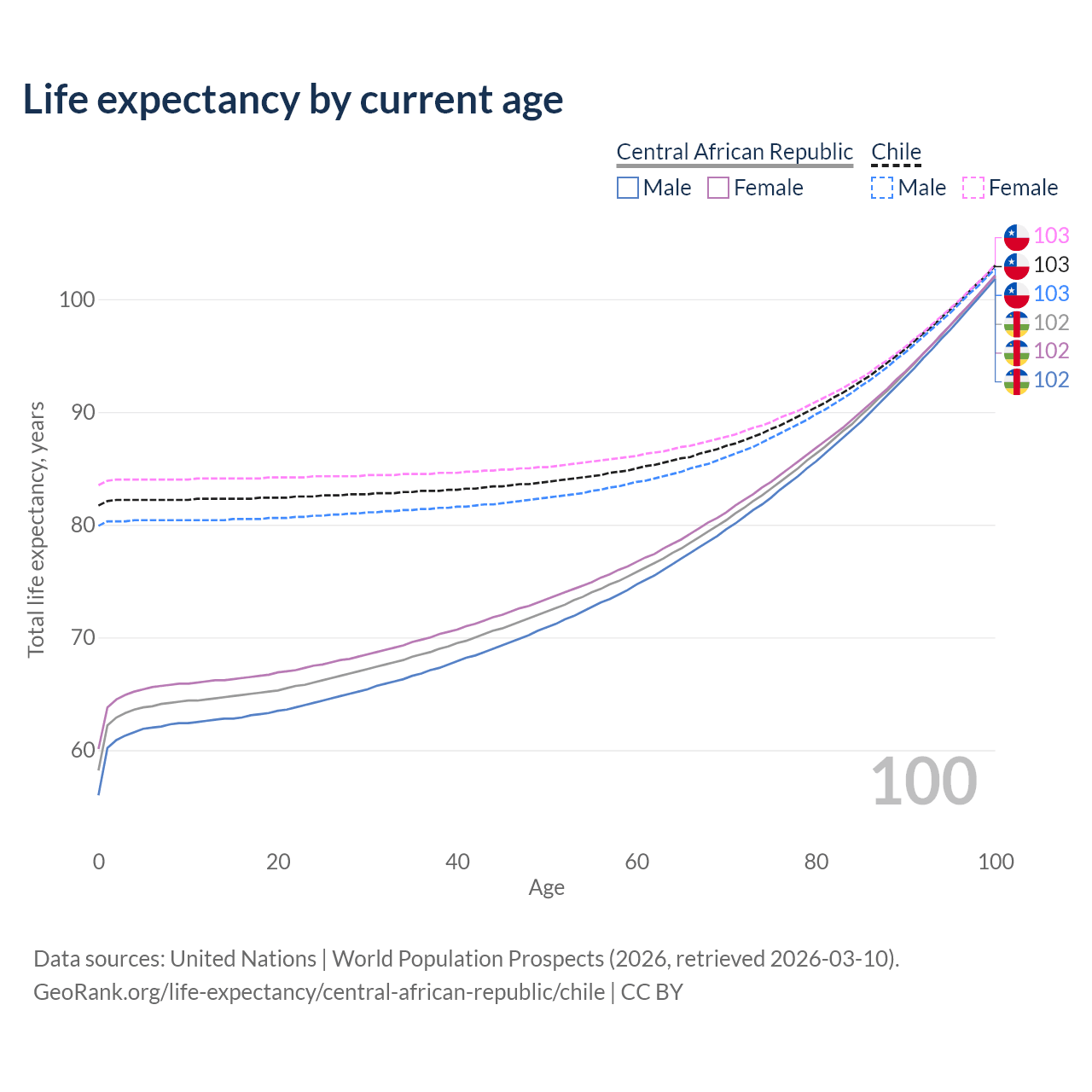 This life expectancy calculator shows the odds of living to 100, 95, 90, and below based on current age for both males and females in the Central African Republic and Chile, along with mean and median age of death. The calculations are based on the 2026 life tables (actuarial tables) from the UN World Population Prospects.
