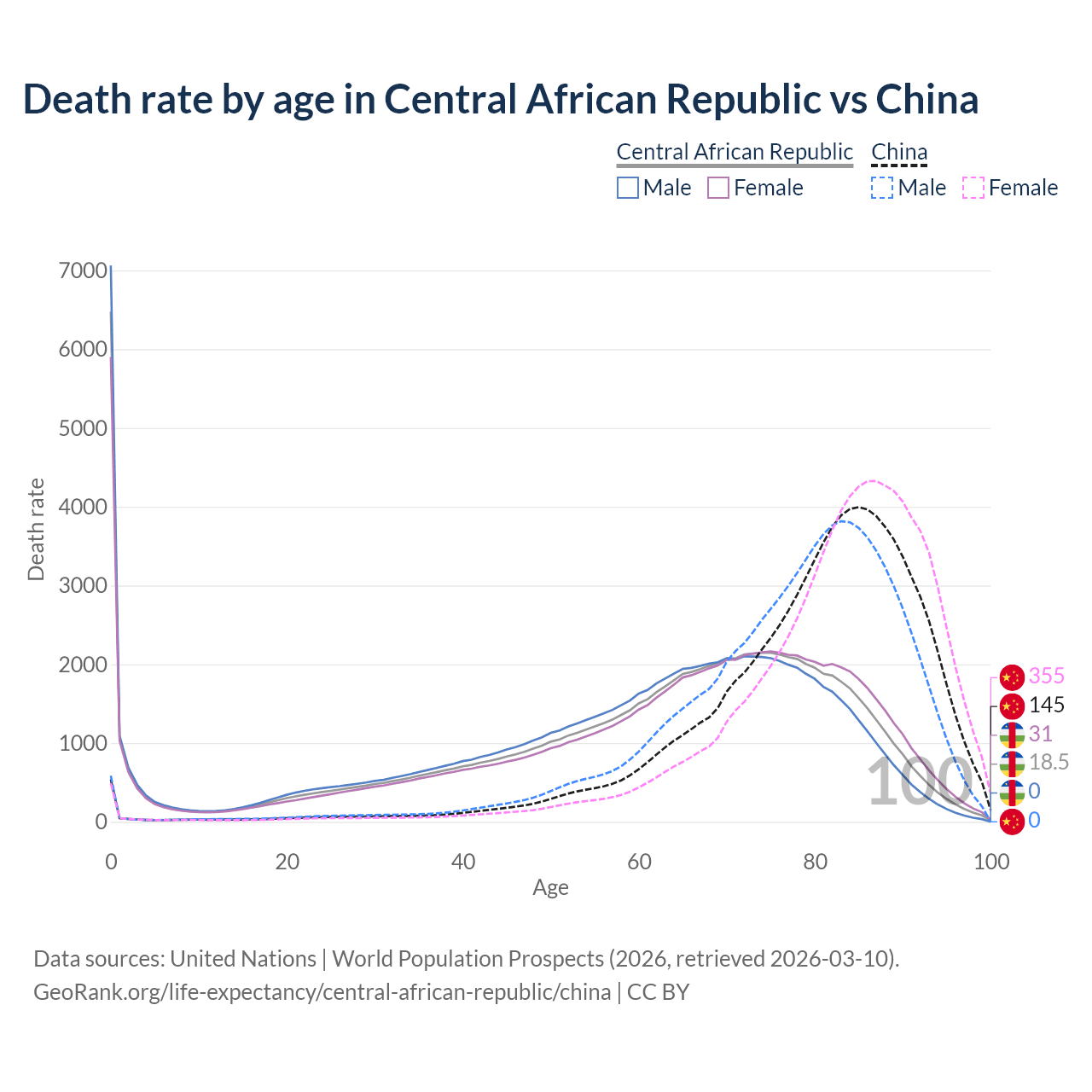 In the Central African Republic, the most common age of death is 0, compared to 85 in China. The median age of death is 65.2 in the Central African Republic and 82.3 in China, meaning only half of each cohort is expected to live past that age.