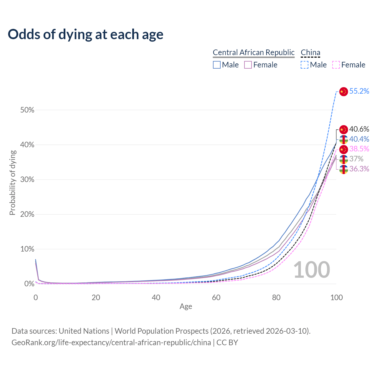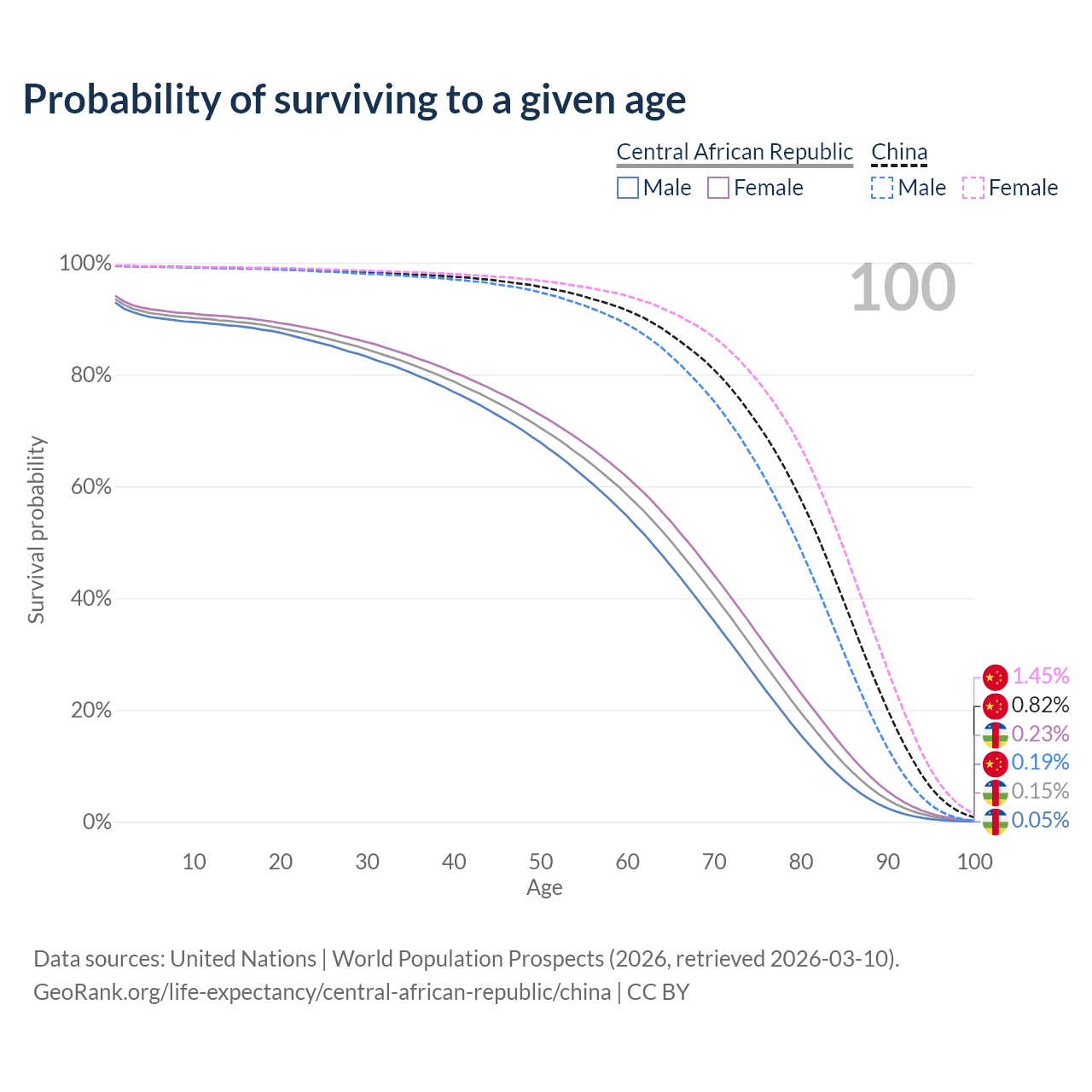 This life expectancy calculator shows the odds of living to 100, 95, 90, and below based on current age for both males and females in the Central African Republic and China, along with mean and median age of death. The calculations are based on the 2026 life tables (actuarial tables) from the UN World Population Prospects.