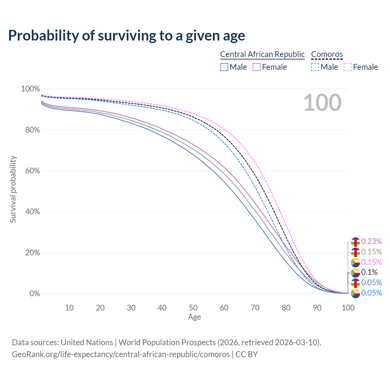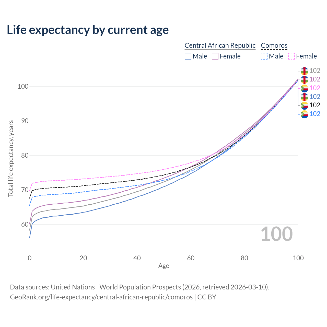 This life expectancy calculator shows the odds of living to 100, 95, 90, and below based on current age for both males and females in the Central African Republic and Comoros, along with mean and median age of death. The calculations are based on the 2026 life tables (actuarial tables) from the UN World Population Prospects.