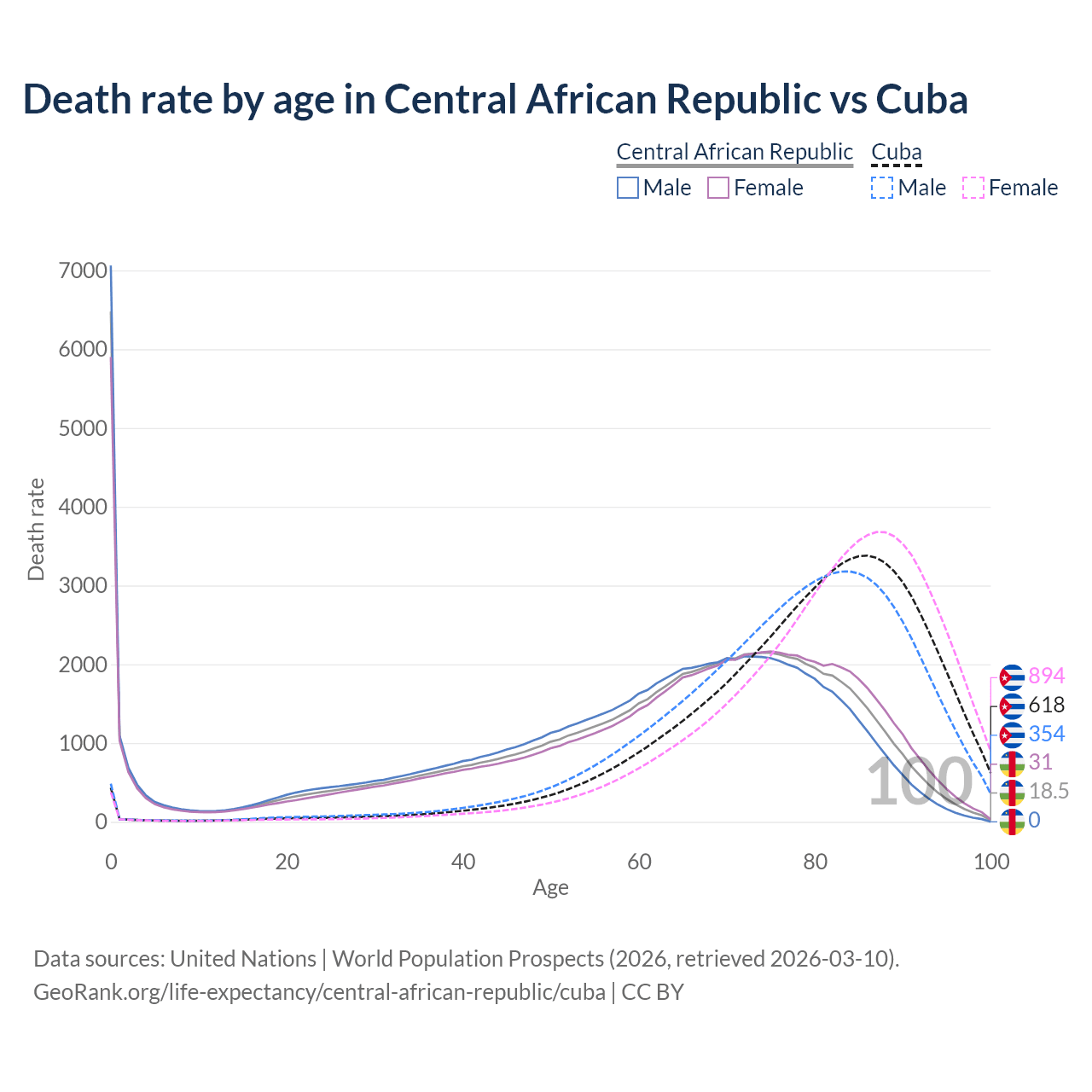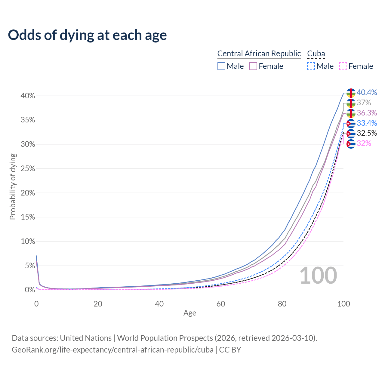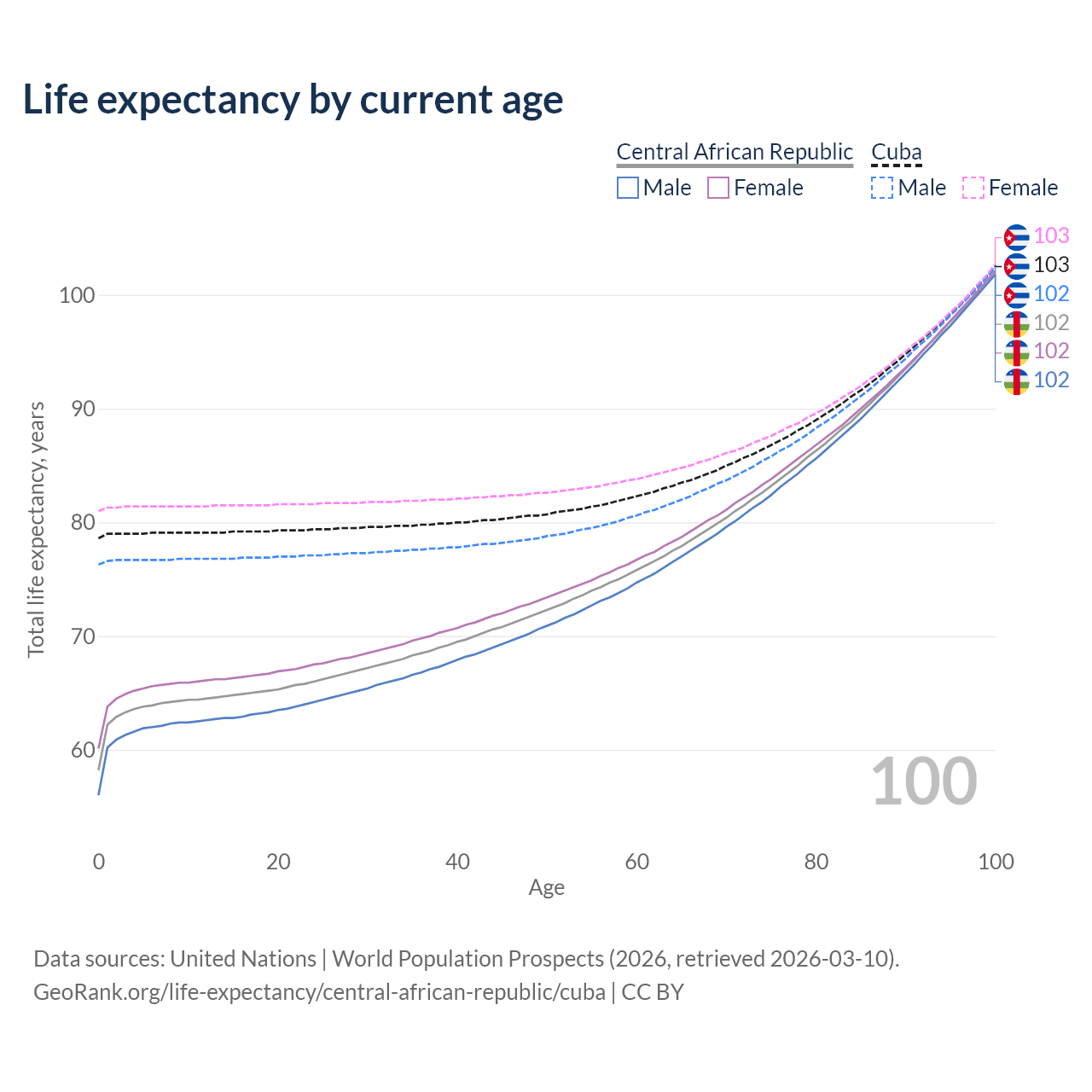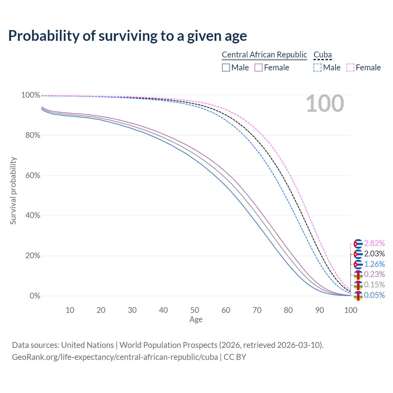 This life expectancy calculator shows the odds of living to 100, 95, 90, and below based on current age for both males and females in the Central African Republic and Cuba, along with mean and median age of death. The calculations are based on the 2026 life tables (actuarial tables) from the UN World Population Prospects.