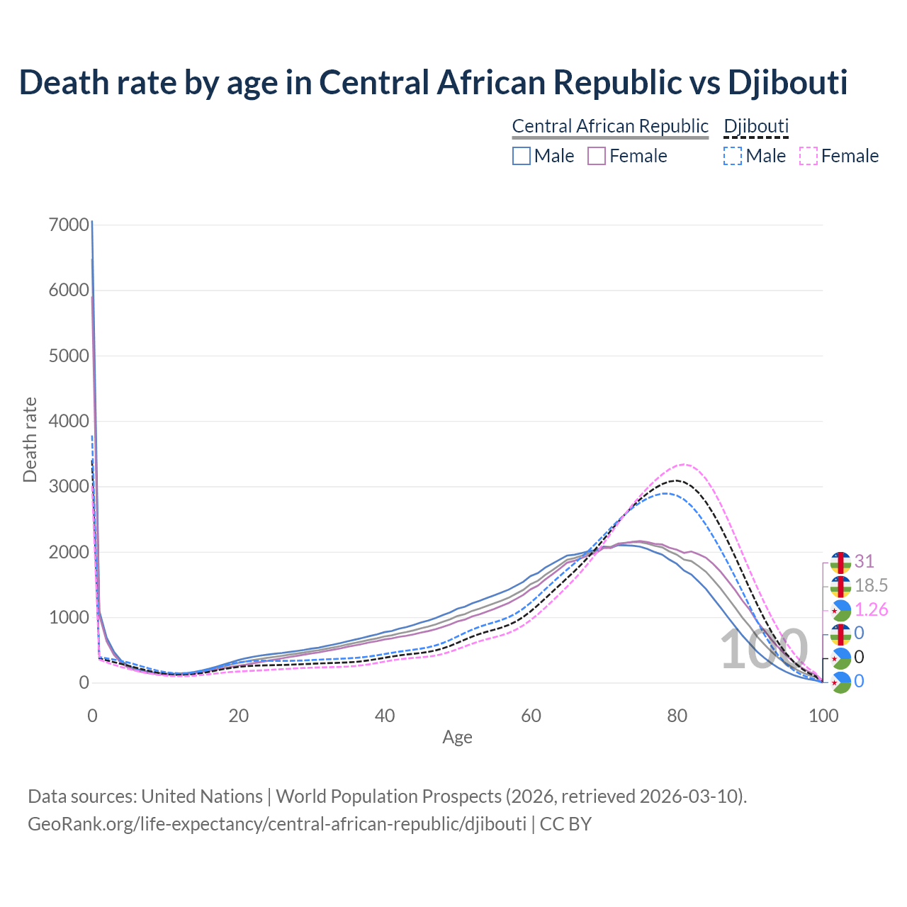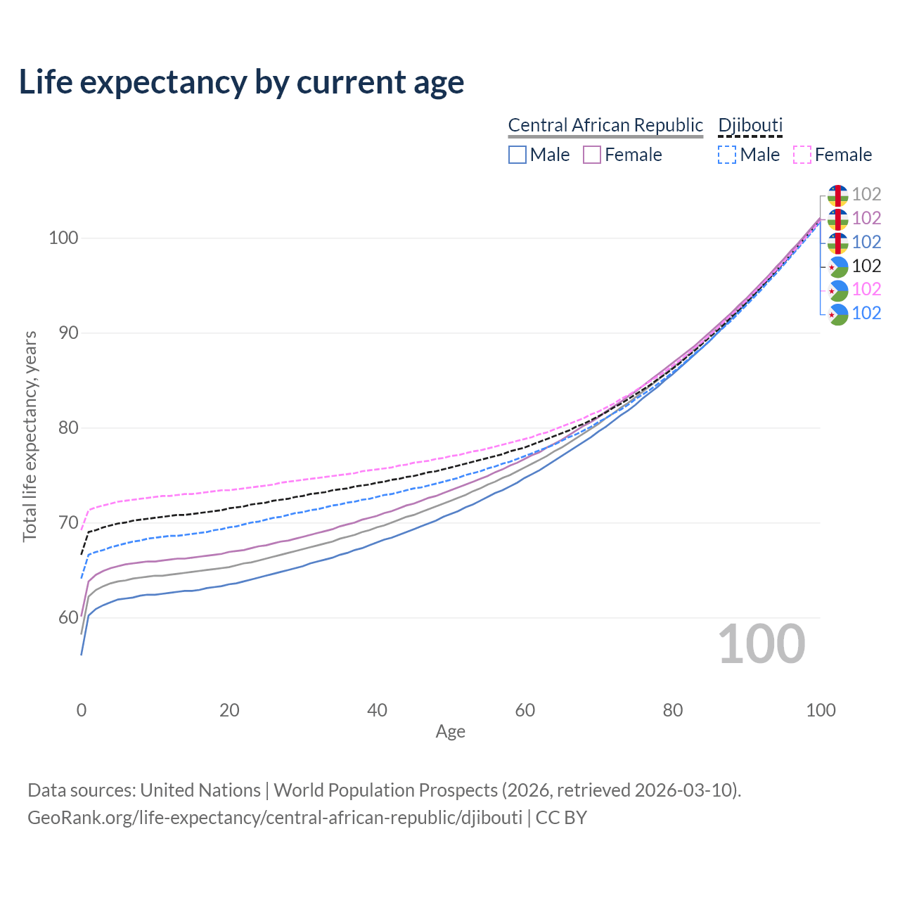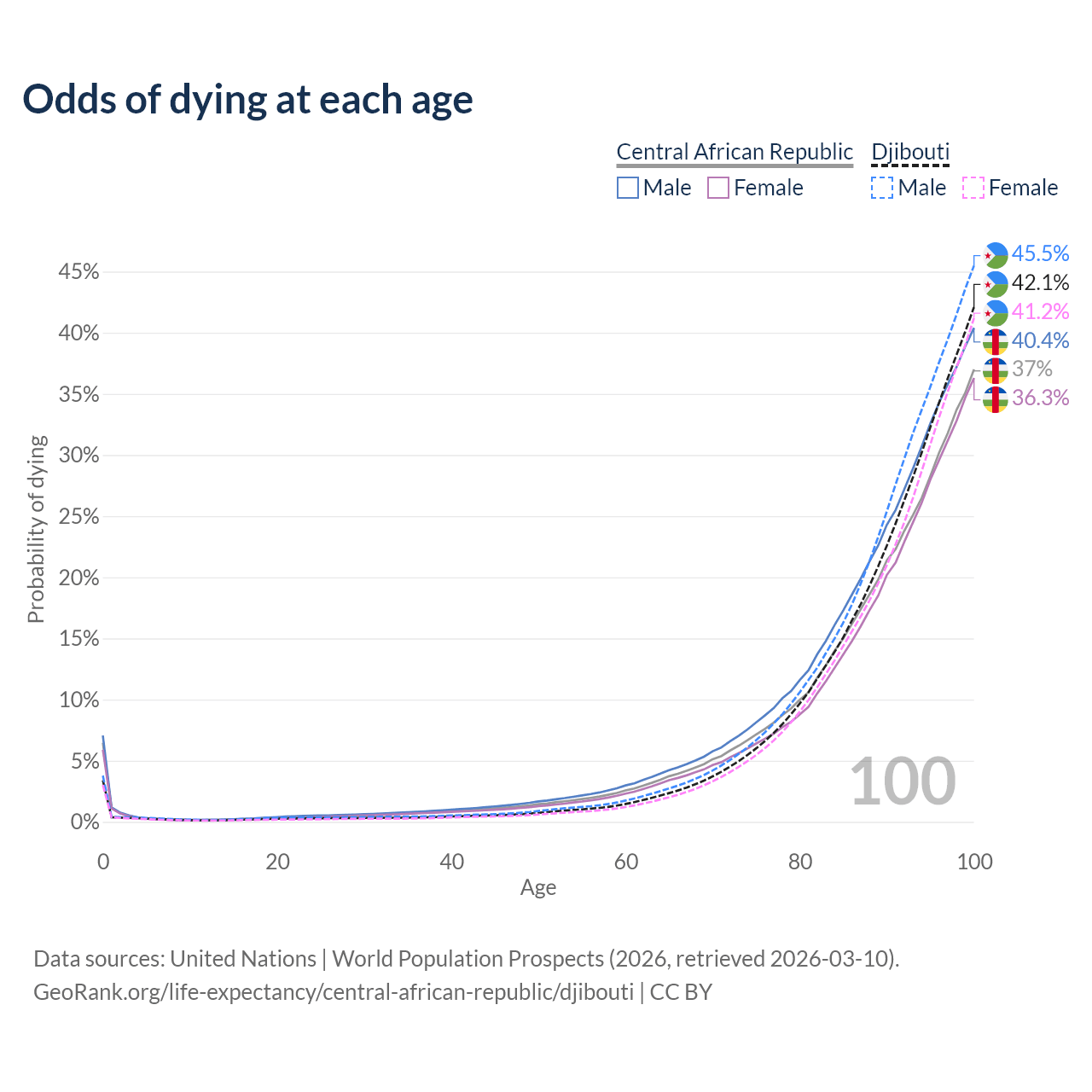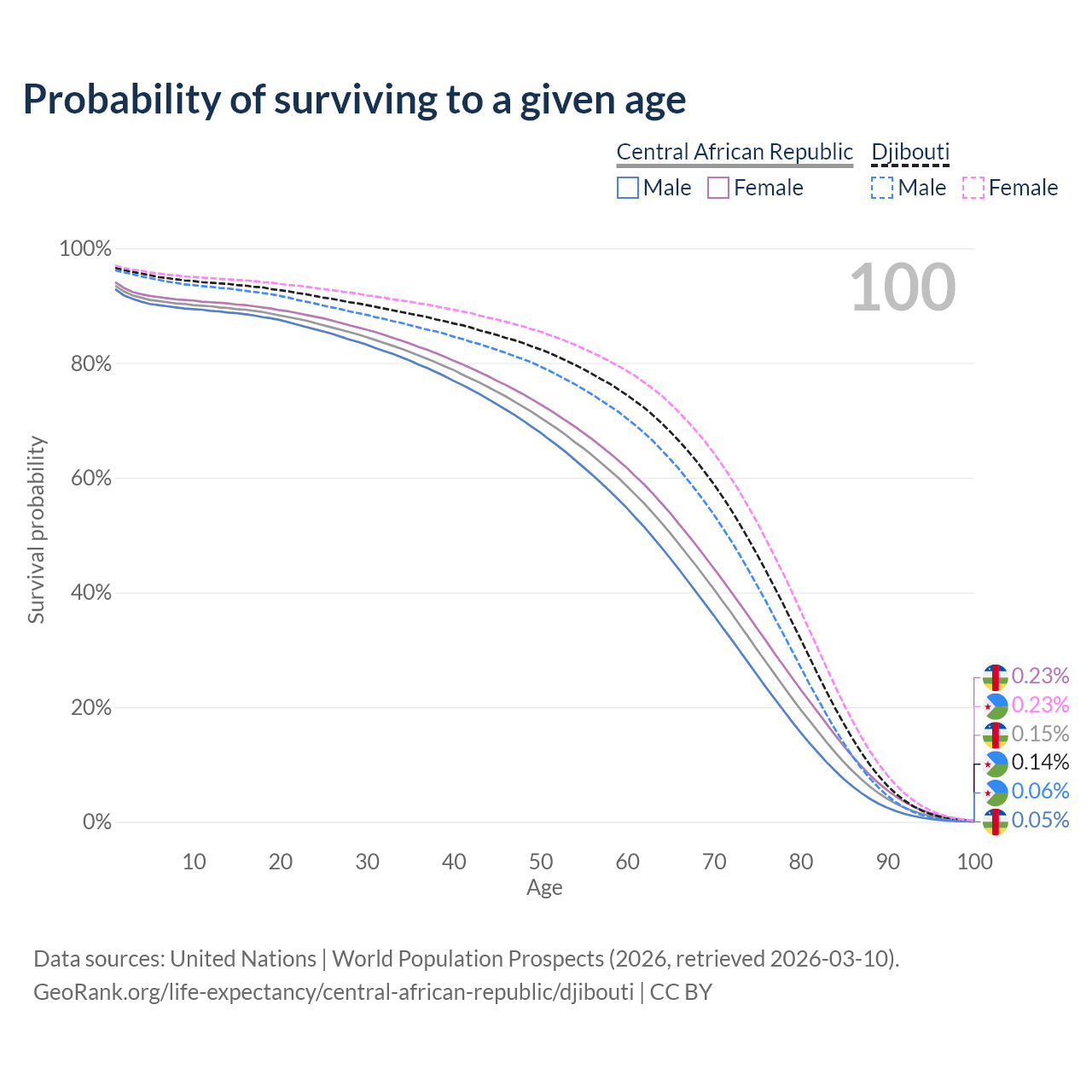 This life expectancy calculator shows the odds of living to 100, 95, 90, and below based on current age for both males and females in the Central African Republic and Djibouti, along with mean and median age of death. The calculations are based on the 2026 life tables (actuarial tables) from the UN World Population Prospects.