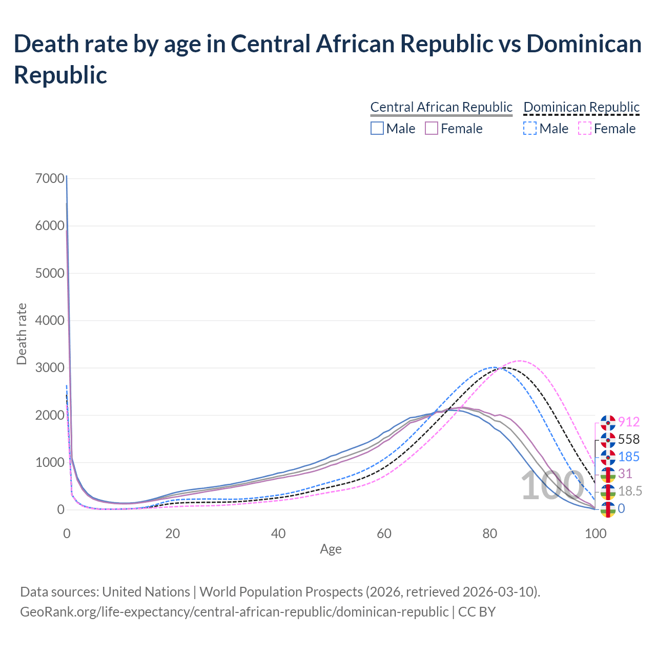 The average life expectancy at birth is 58.2 years in the Central African Republic vs 74.1 in the Dominican Republic. The Central African Republic is ranked 194/197 by life expectancy, and the Dominican Republic is 101/197. In the Central African Republic, the life expectancy is 56 years for males and 60.1 years for females. In the Dominican Republic, it's 70.9 years for males and 77.4 years for females.