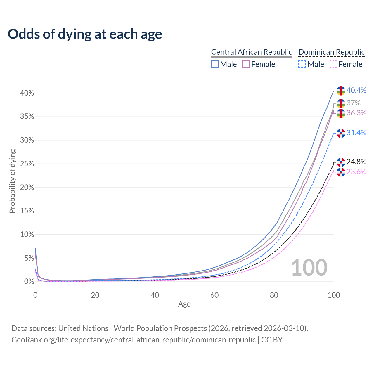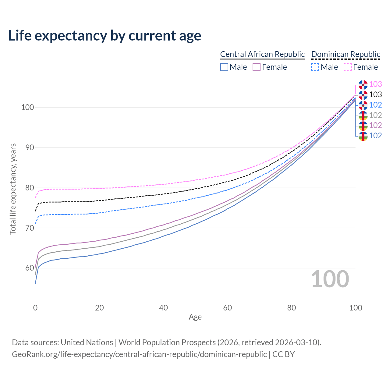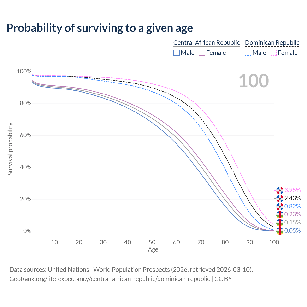 This life expectancy calculator shows the odds of living to 100, 95, 90, and below based on current age for both males and females in the Central African Republic and the Dominican Republic, along with mean and median age of death. The calculations are based on the 2026 life tables (actuarial tables) from the UN World Population Prospects.