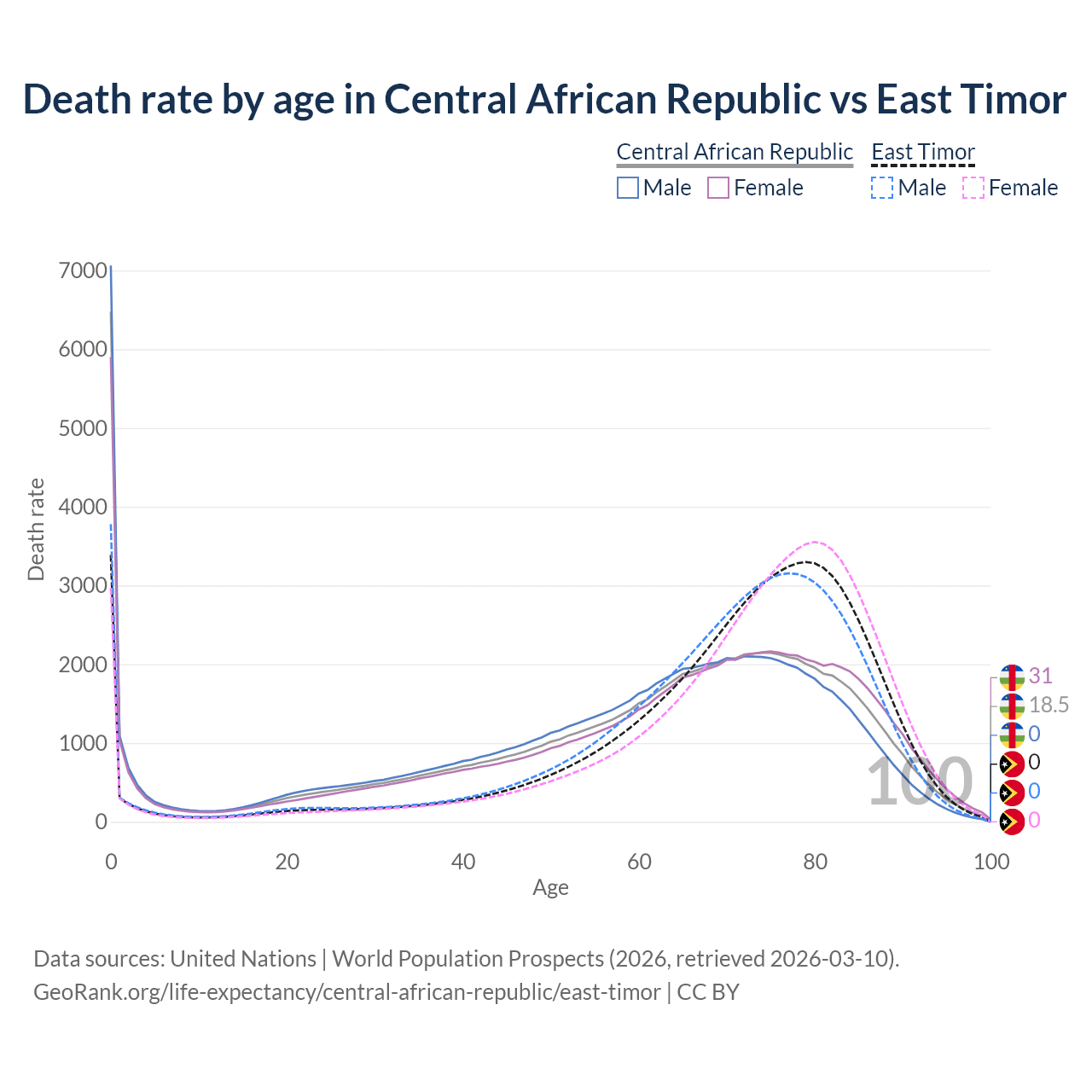 In the Central African Republic, the most common age of death is 0, compared to 0 in East Timor. The median age of death is 65.2 in the Central African Republic and 73.9 in East Timor, meaning only half of each cohort is expected to live past that age.