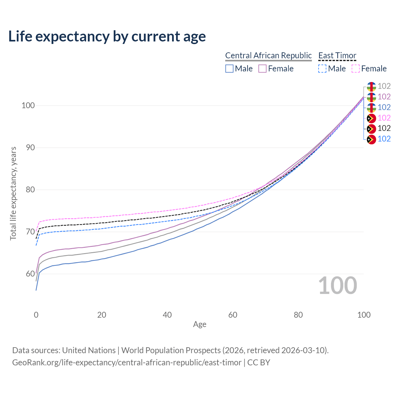 This life expectancy calculator shows the odds of living to 100, 95, 90, and below based on current age for both males and females in the Central African Republic and East Timor, along with mean and median age of death. The calculations are based on the 2026 life tables (actuarial tables) from the UN World Population Prospects.