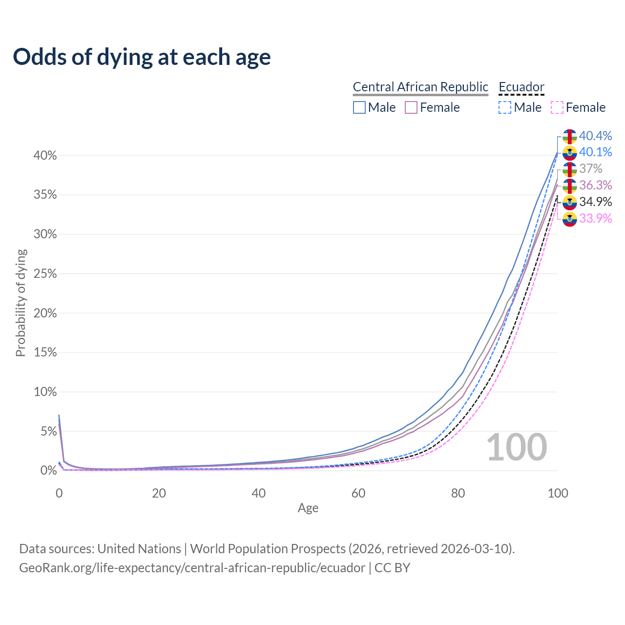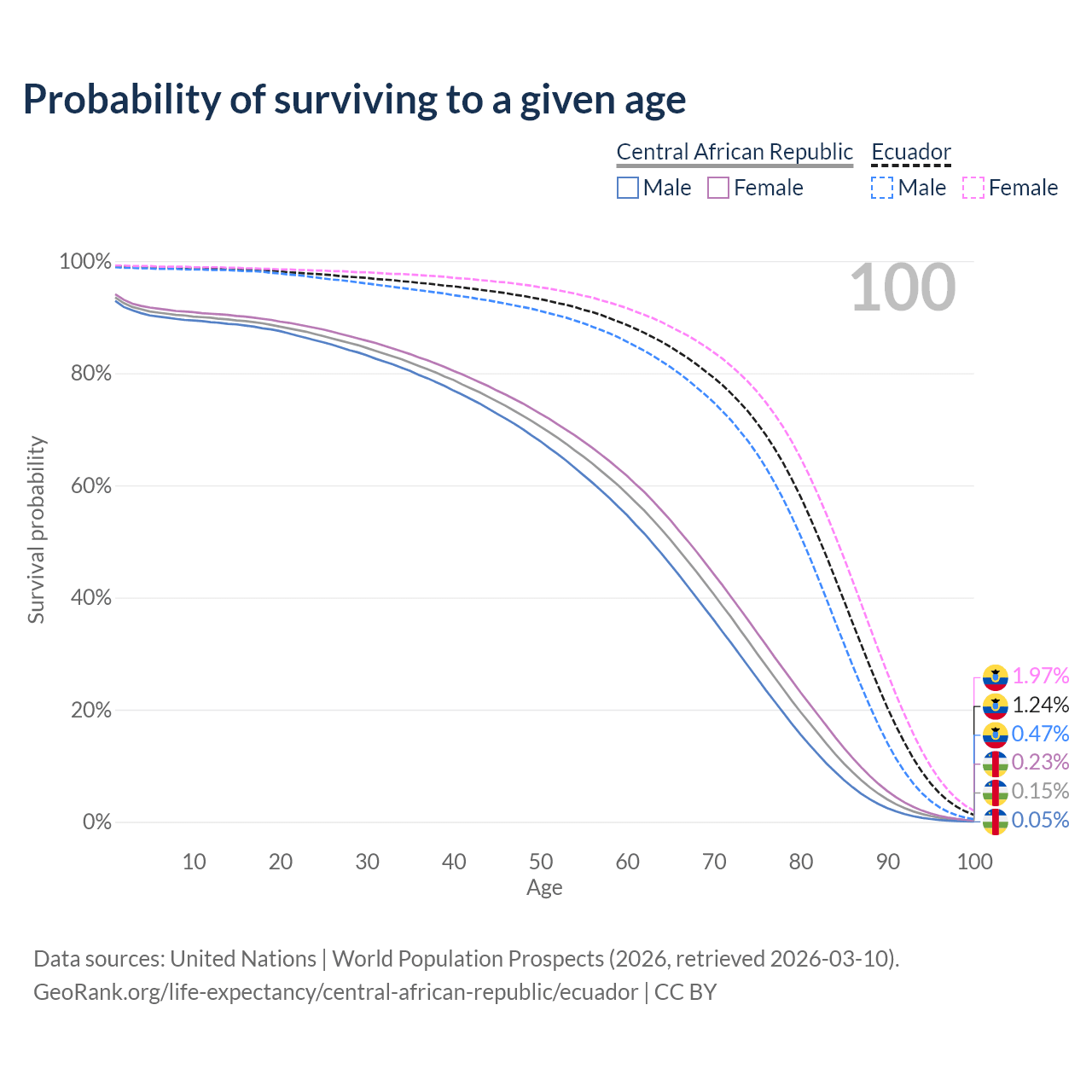 This life expectancy calculator shows the odds of living to 100, 95, 90, and below based on current age for both males and females in the Central African Republic and Ecuador, along with mean and median age of death. The calculations are based on the 2026 life tables (actuarial tables) from the UN World Population Prospects.