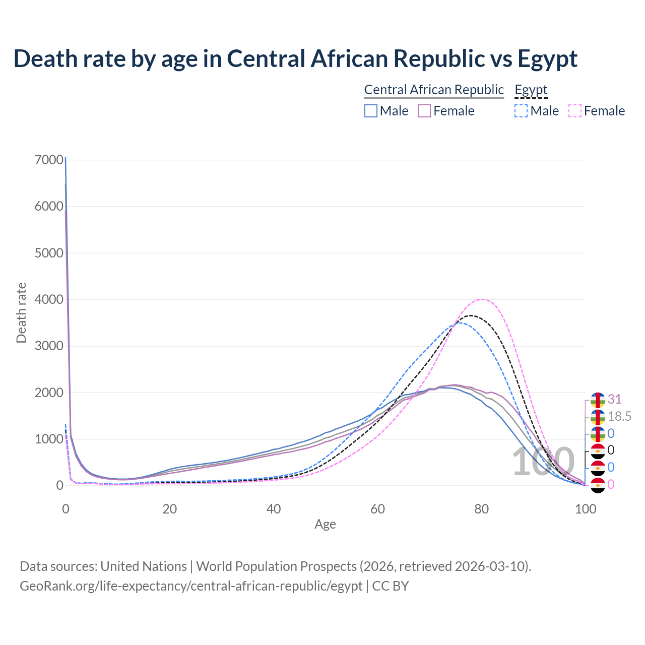 In the Central African Republic, the most common age of death is 0, compared to 78 in Egypt. The median age of death is 65.2 in the Central African Republic and 75.2 in Egypt, meaning only half of each cohort is expected to live past that age.