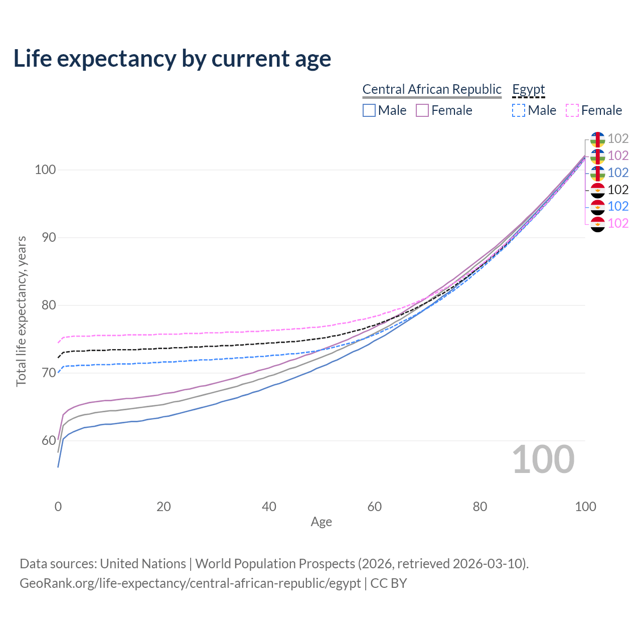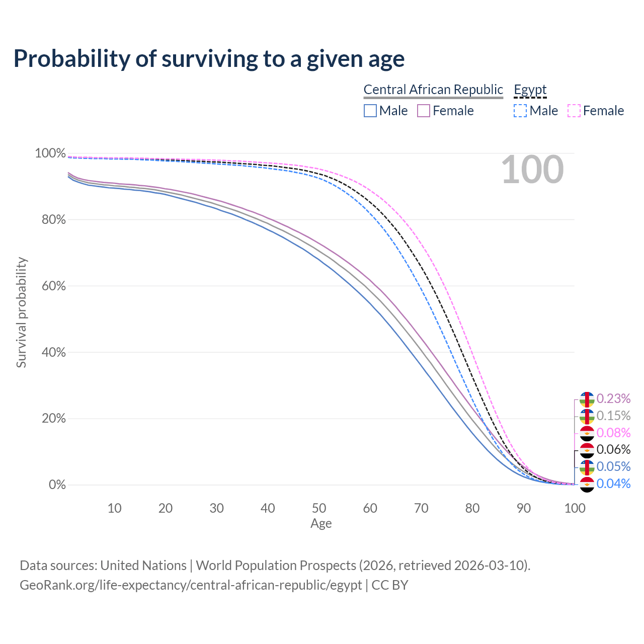This life expectancy calculator shows the odds of living to 100, 95, 90, and below based on current age for both males and females in the Central African Republic and Egypt, along with mean and median age of death. The calculations are based on the 2026 life tables (actuarial tables) from the UN World Population Prospects.