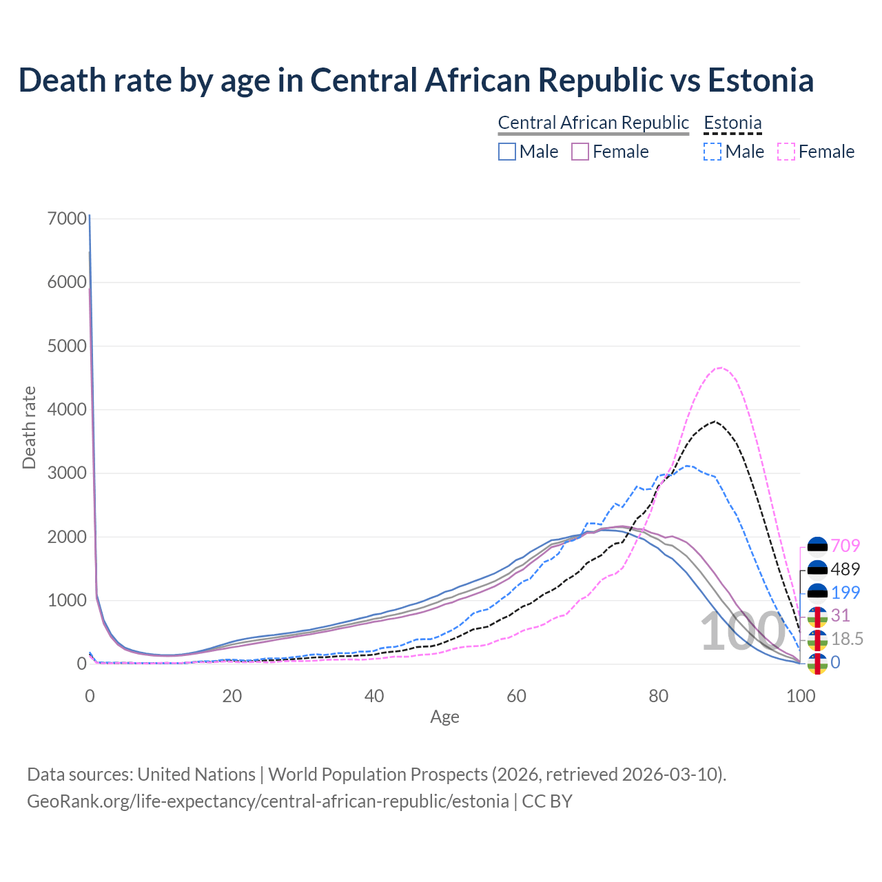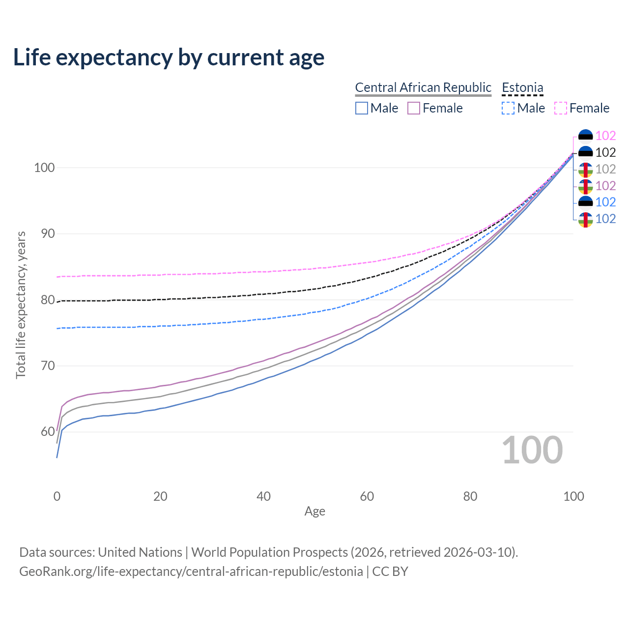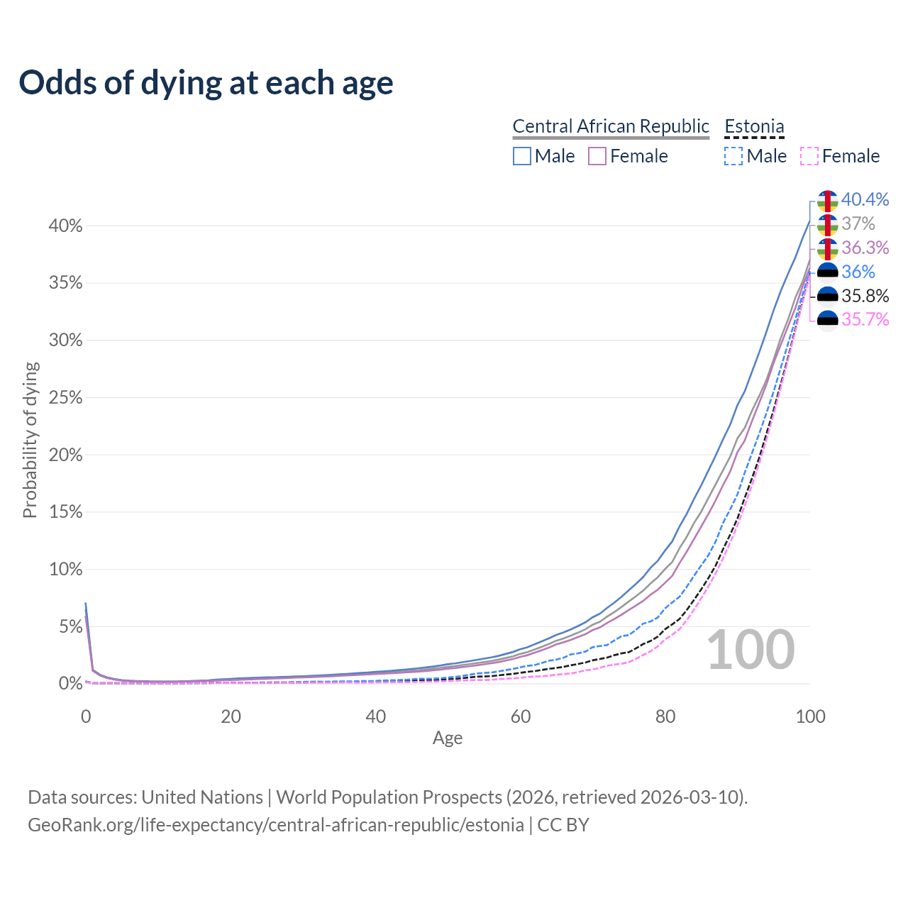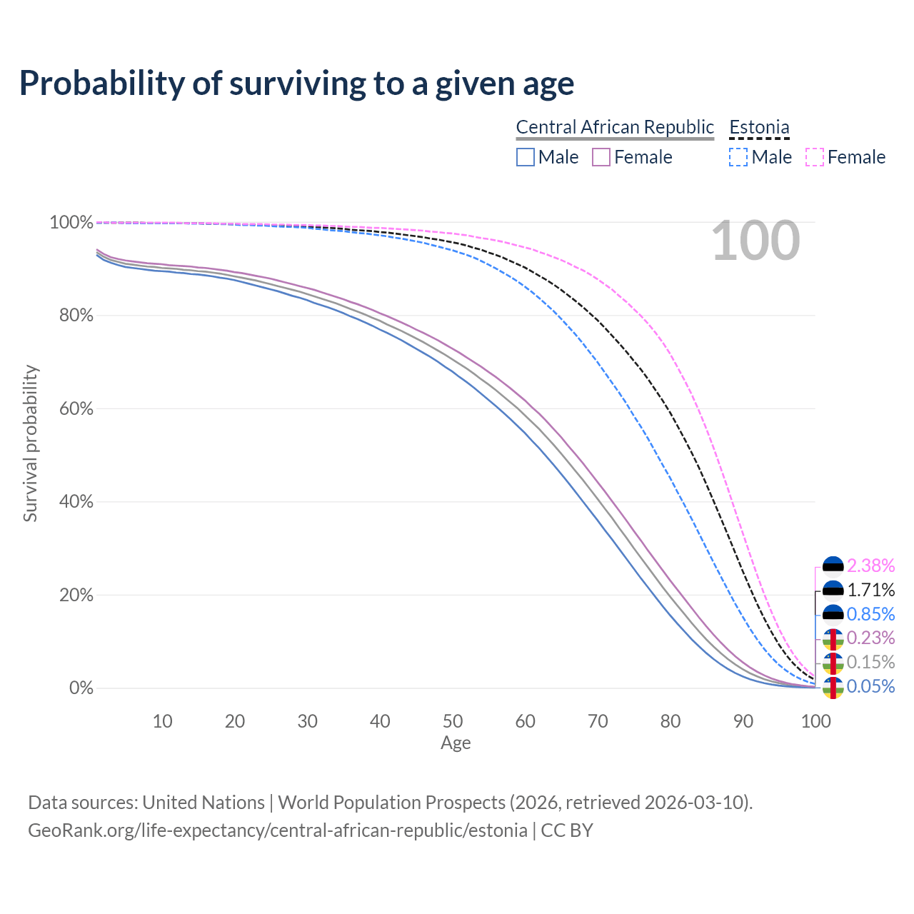 This life expectancy calculator shows the odds of living to 100, 95, 90, and below based on current age for both males and females in the Central African Republic and Estonia, along with mean and median age of death. The calculations are based on the 2026 life tables (actuarial tables) from the UN World Population Prospects.