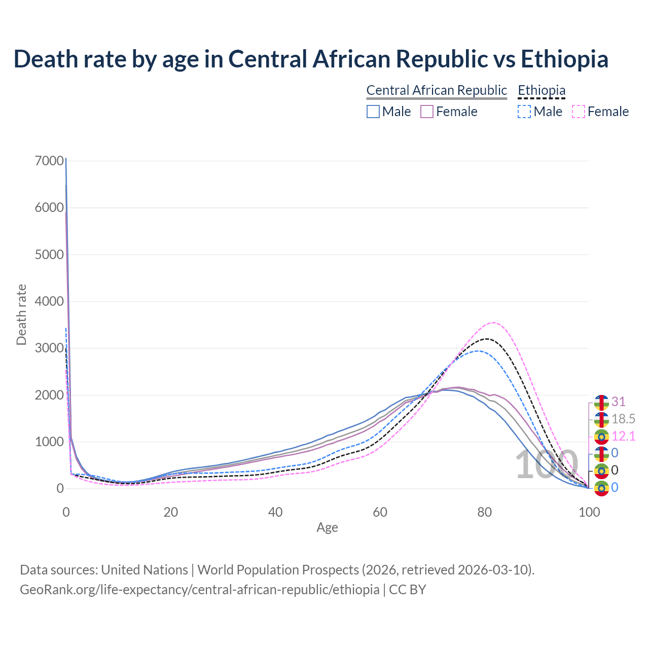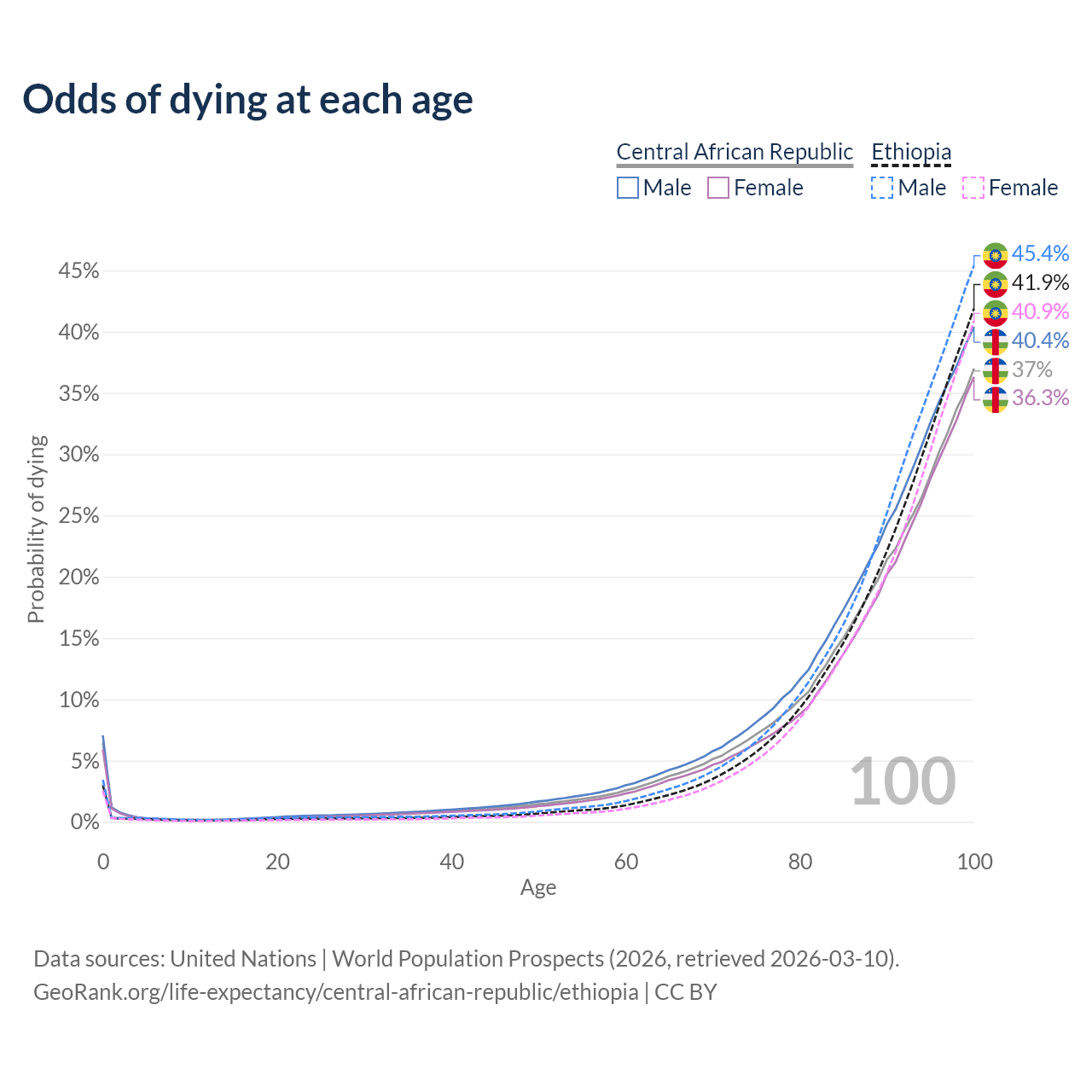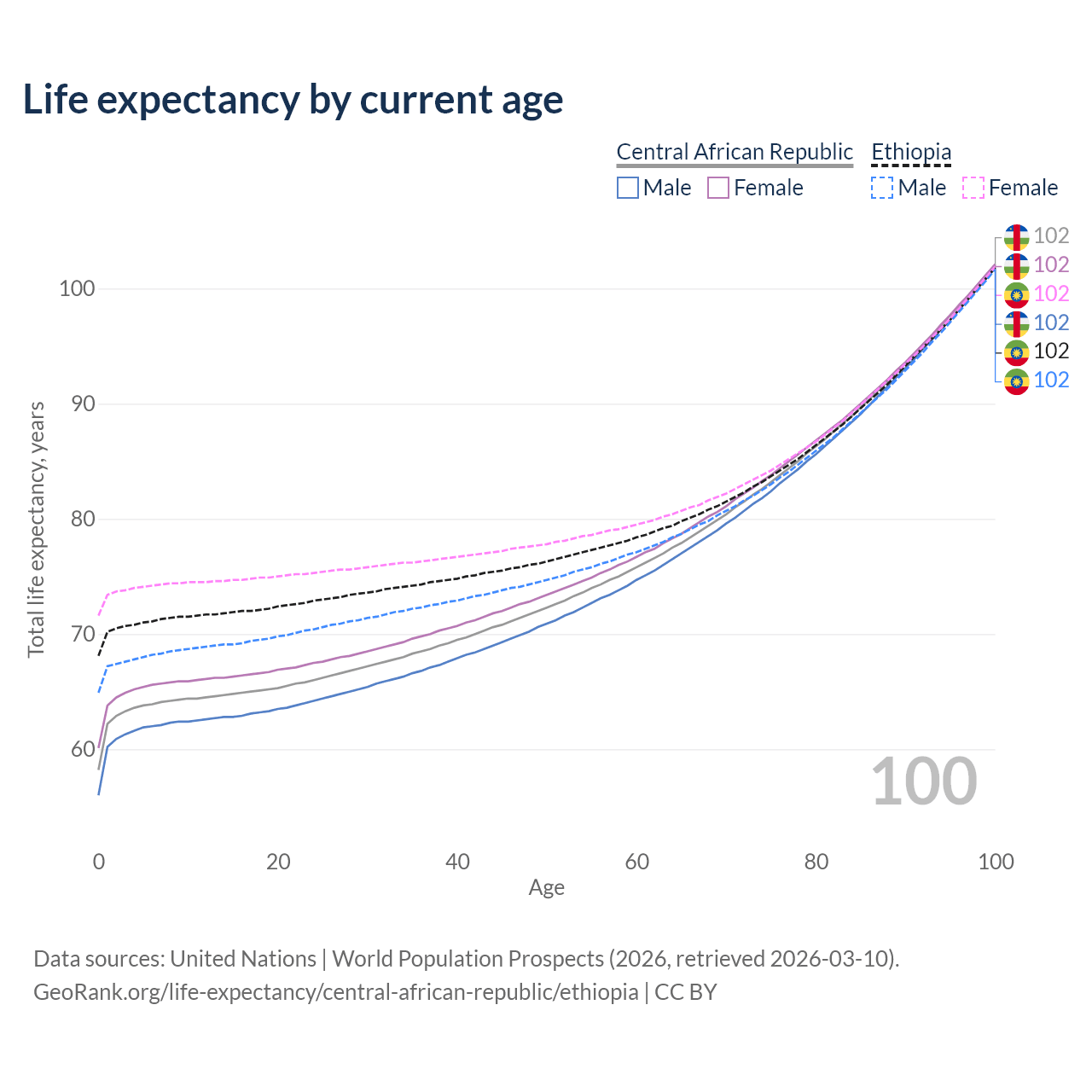 This life expectancy calculator shows the odds of living to 100, 95, 90, and below based on current age for both males and females in the Central African Republic and Ethiopia, along with mean and median age of death. The calculations are based on the 2026 life tables (actuarial tables) from the UN World Population Prospects.