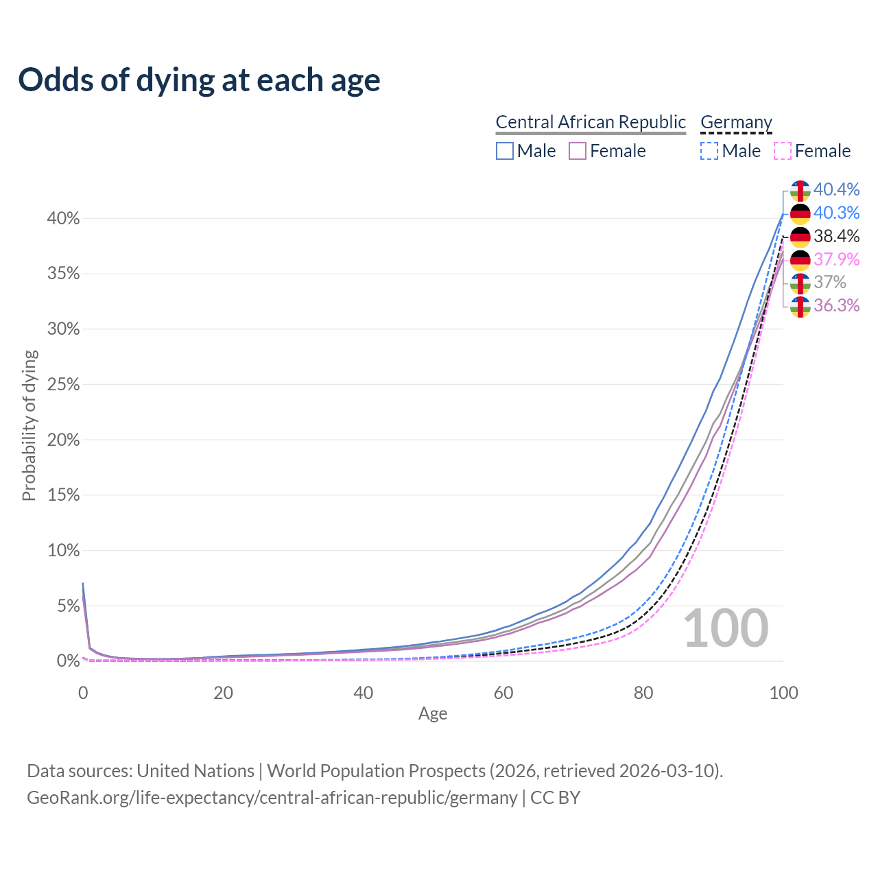 This life expectancy calculator shows the odds of living to 100, 95, 90, and below based on current age for both males and females in the Central African Republic and Germany, along with mean and median age of death. The calculations are based on the 2026 life tables (actuarial tables) from the UN World Population Prospects.
