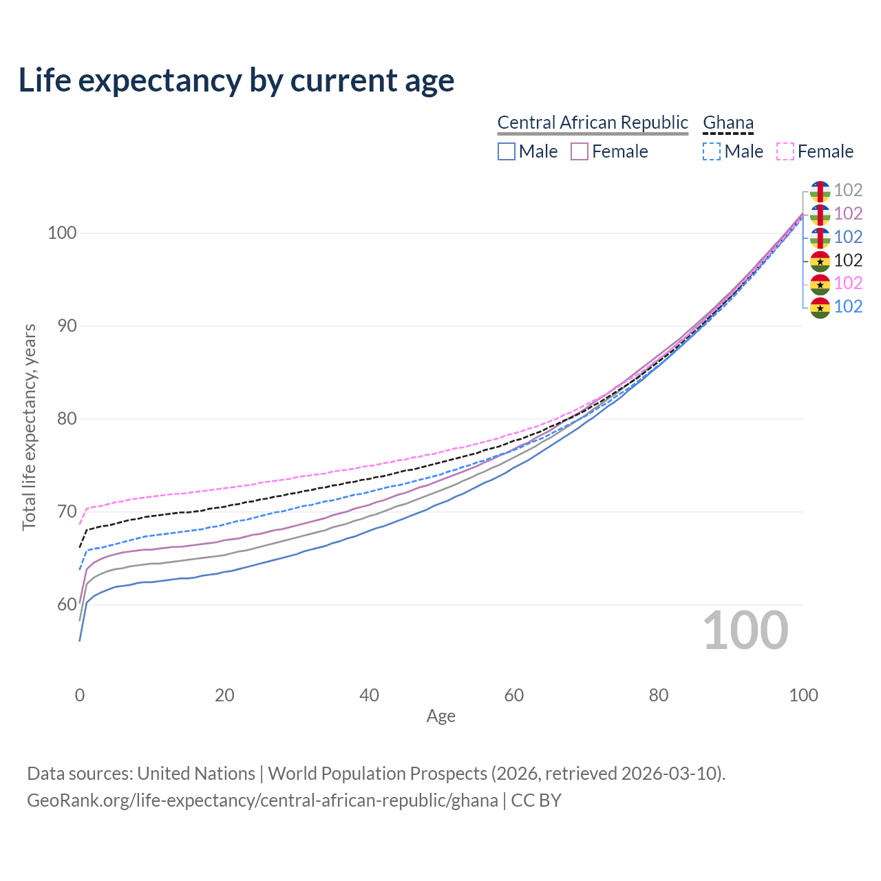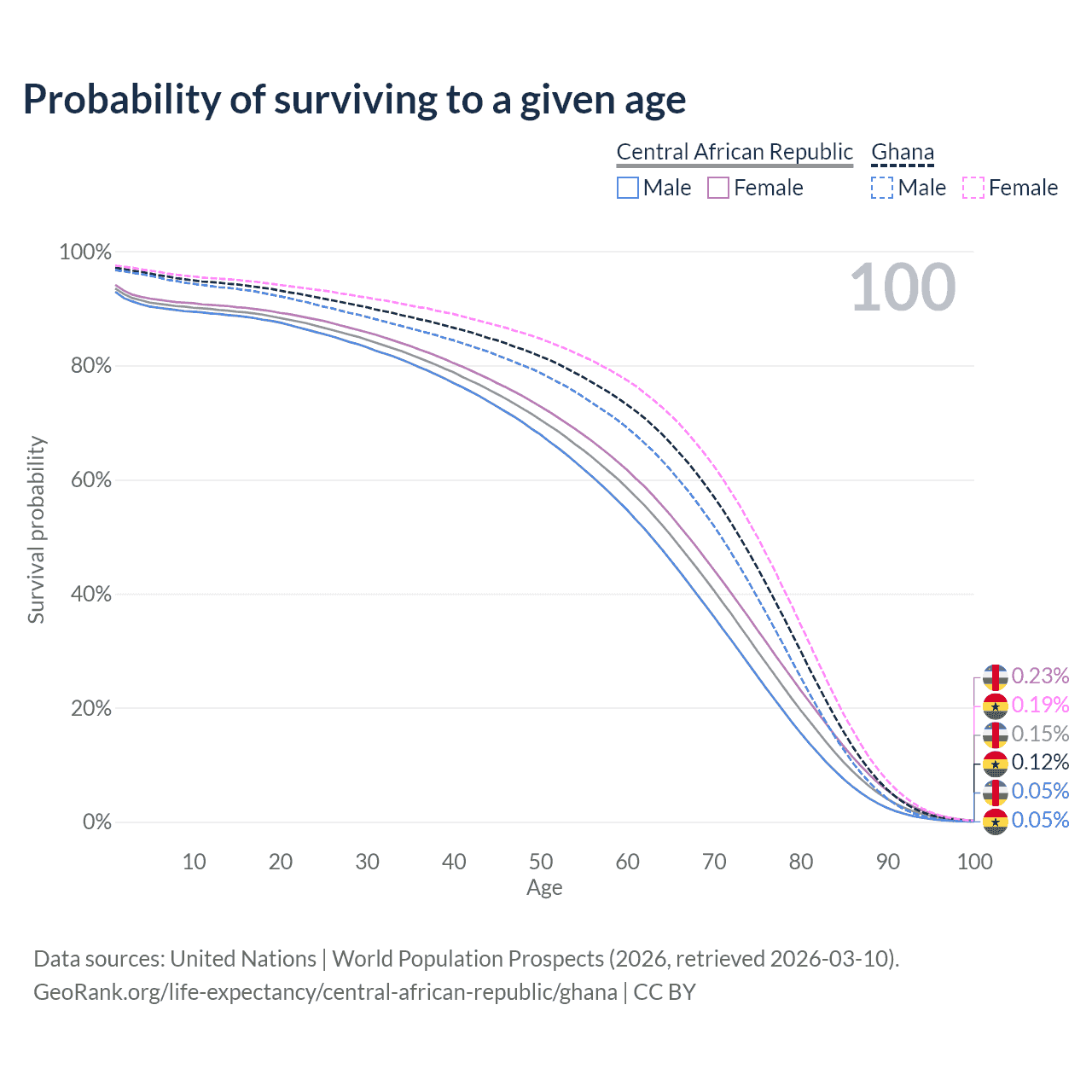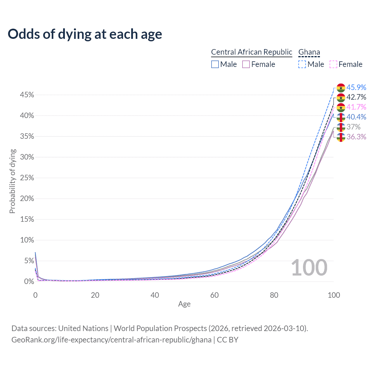 This life expectancy calculator shows the odds of living to 100, 95, 90, and below based on current age for both males and females in the Central African Republic and Ghana, along with mean and median age of death. The calculations are based on the 2026 life tables (actuarial tables) from the UN World Population Prospects.