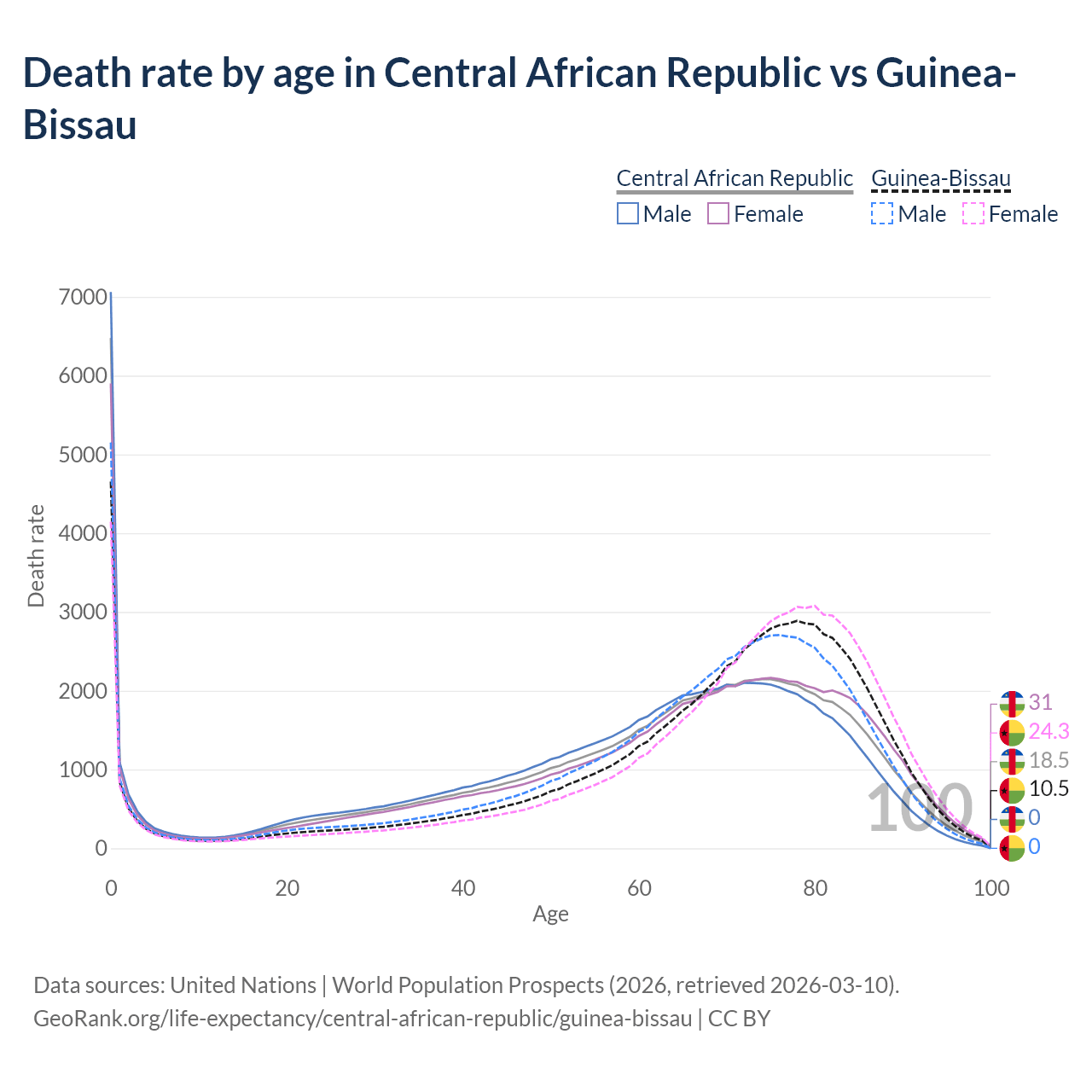 In the Central African Republic, the most common age of death is 0, compared to 0 in Guinea-Bissau. The median age of death is 65.2 in the Central African Republic and 71.8 in Guinea-Bissau, meaning only half of each cohort is expected to live past that age.