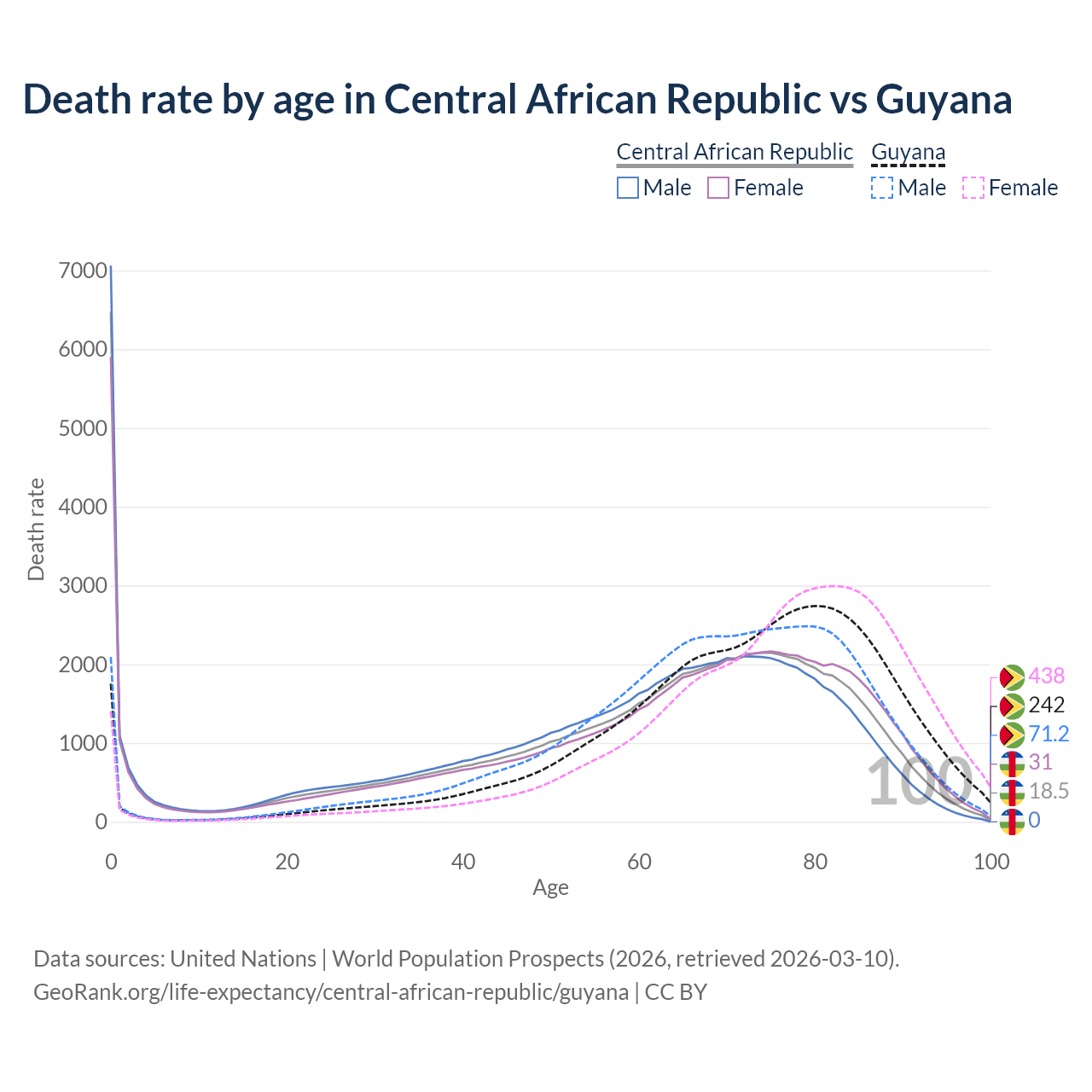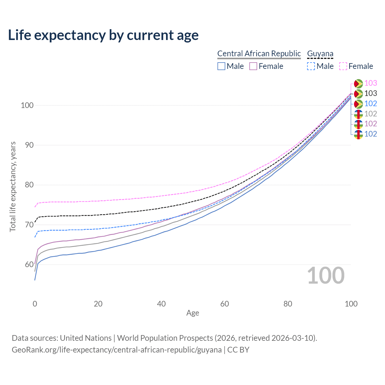 This life expectancy calculator shows the odds of living to 100, 95, 90, and below based on current age for both males and females in the Central African Republic and Guyana, along with mean and median age of death. The calculations are based on the 2026 life tables (actuarial tables) from the UN World Population Prospects.