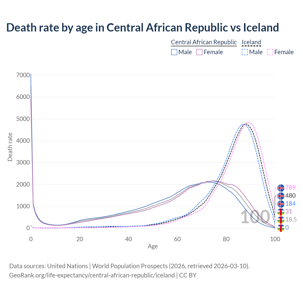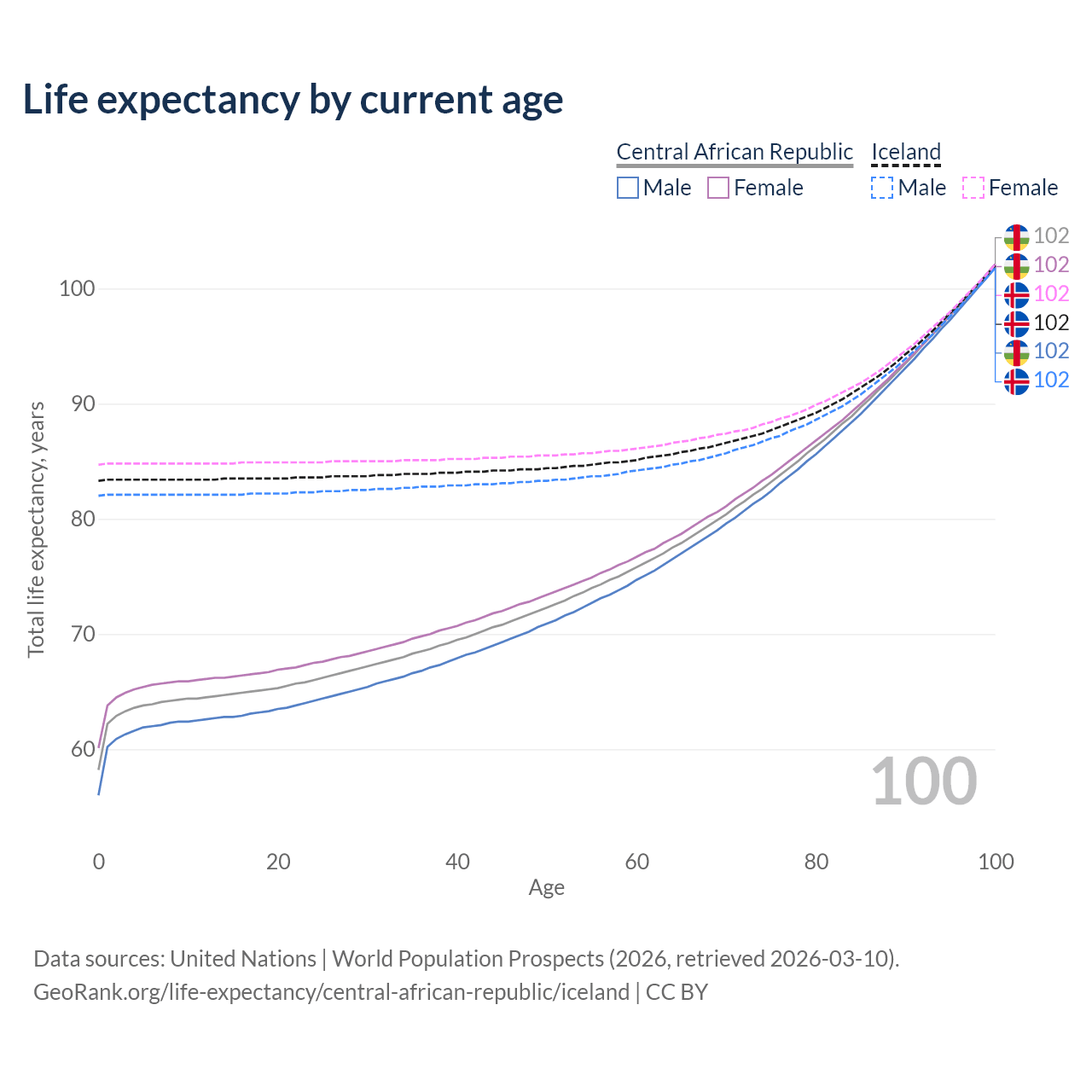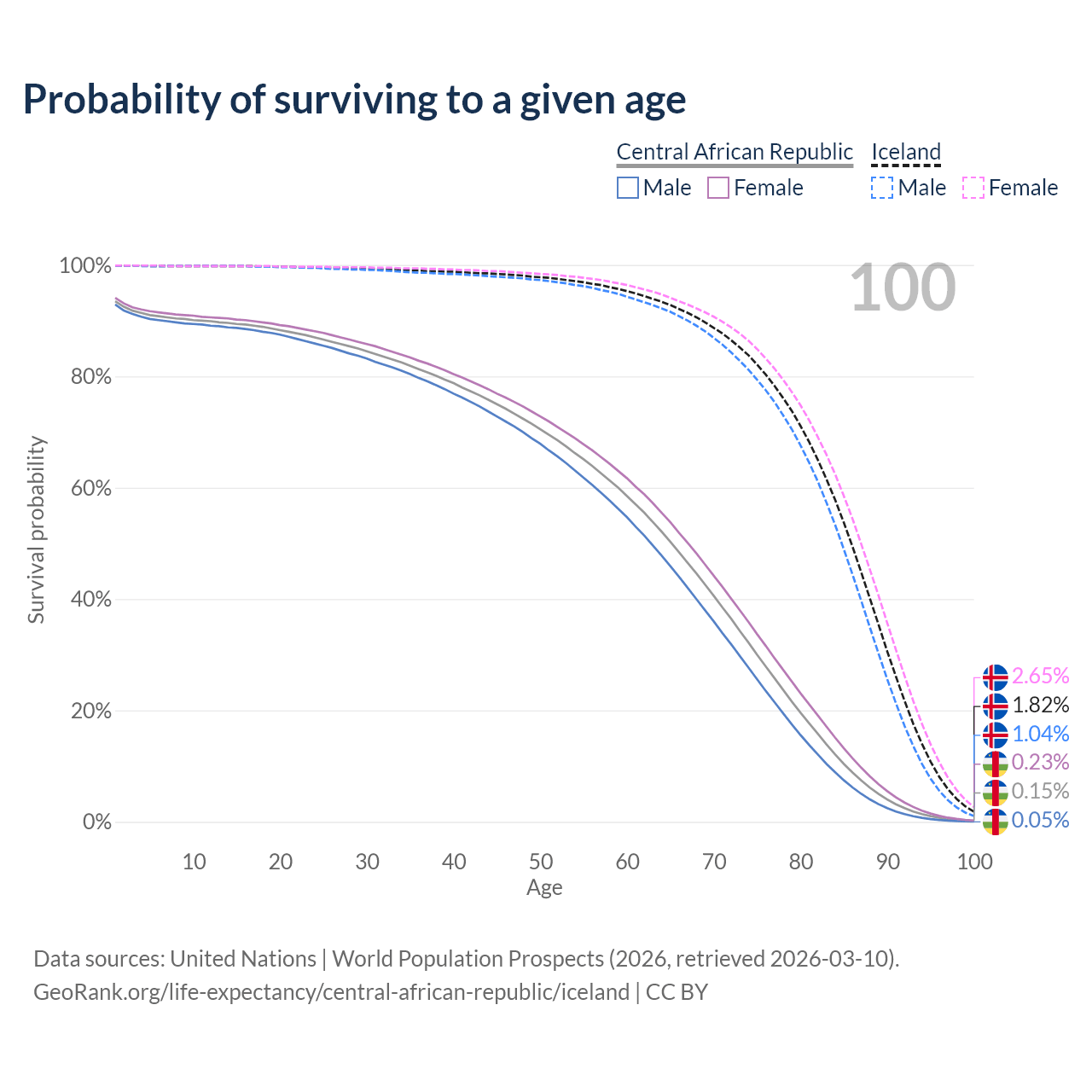 This life expectancy calculator shows the odds of living to 100, 95, 90, and below based on current age for both males and females in the Central African Republic and Iceland, along with mean and median age of death. The calculations are based on the 2026 life tables (actuarial tables) from the UN World Population Prospects.