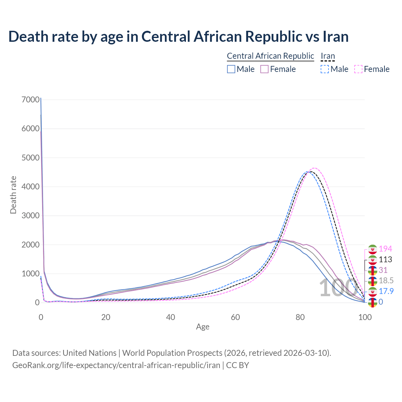 In the Central African Republic, the most common age of death is 0, compared to 83 in Iran. The median age of death is 65.2 in the Central African Republic and 81.8 in Iran, meaning only half of each cohort is expected to live past that age.