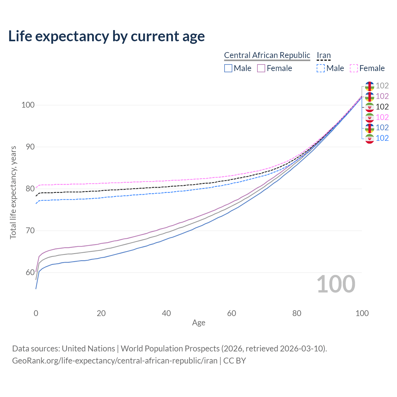 This life expectancy calculator shows the odds of living to 100, 95, 90, and below based on current age for both males and females in the Central African Republic and Iran, along with mean and median age of death. The calculations are based on the 2026 life tables (actuarial tables) from the UN World Population Prospects.