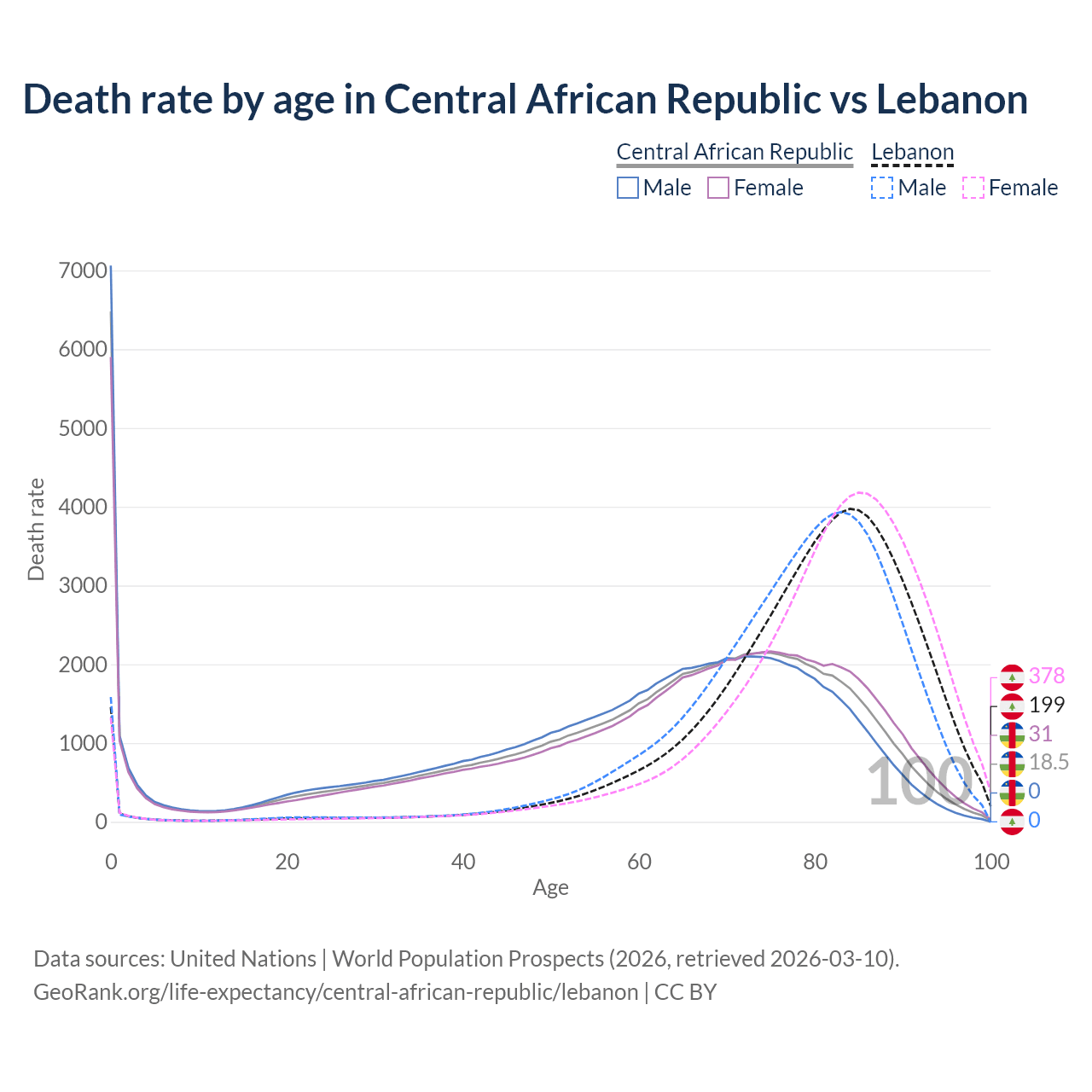 In the Central African Republic, the most common age of death is 0, compared to 84 in Lebanon. The median age of death is 65.2 in the Central African Republic and 81.6 in Lebanon, meaning only half of each cohort is expected to live past that age.
