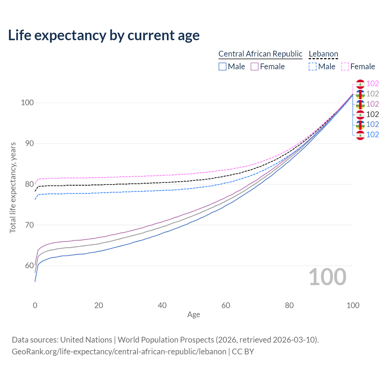 The average life expectancy at birth is 58.2 years in the Central African Republic vs 78.2 in Lebanon. The Central African Republic is ranked 194/197 by life expectancy, and Lebanon is 62/197. In the Central African Republic, the life expectancy is 56 years for males and 60.1 years for females. In Lebanon, it's 76.2 years for males and 80.1 years for females.