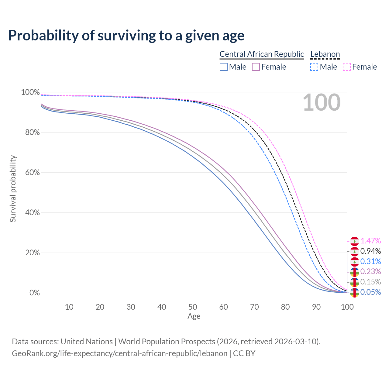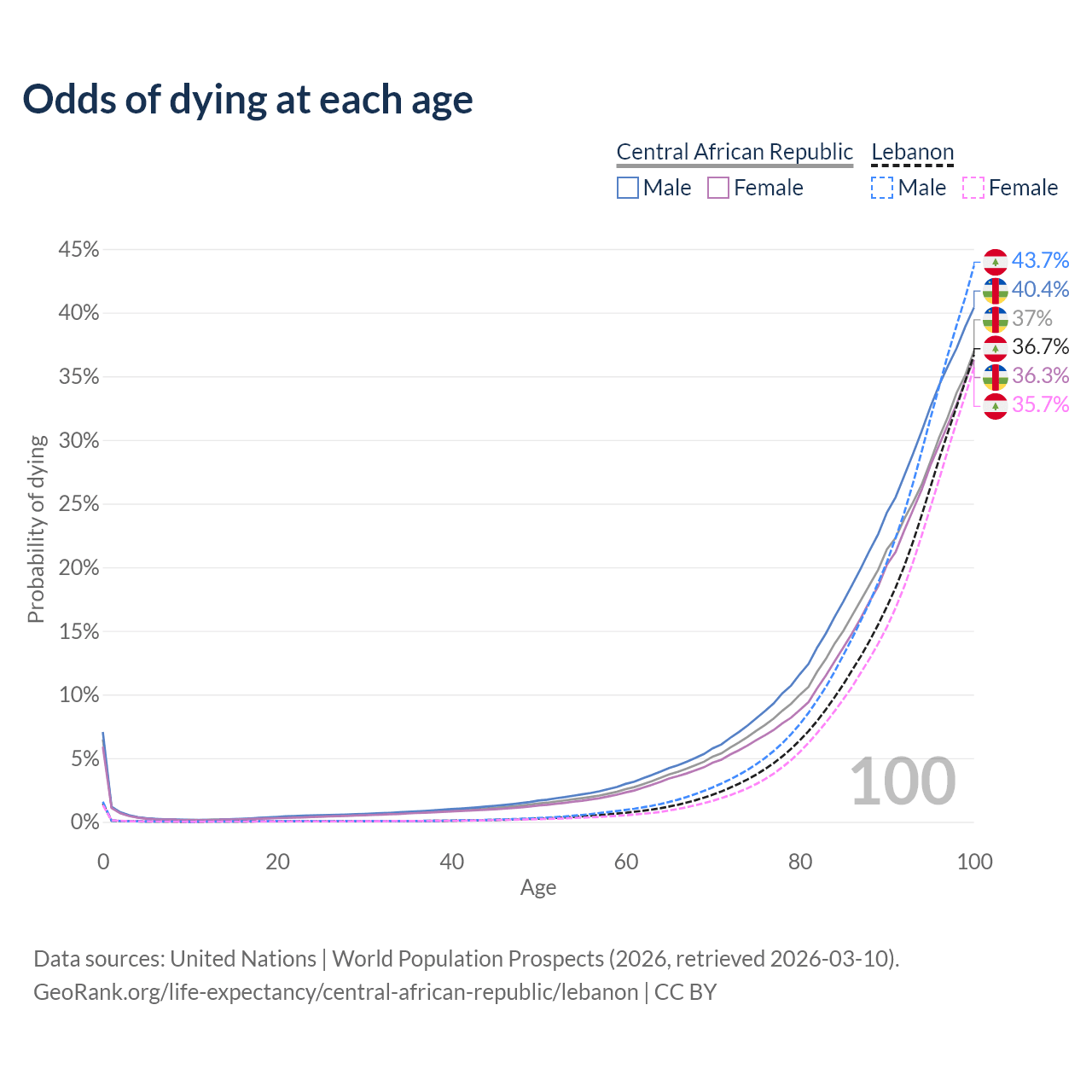 This life expectancy calculator shows the odds of living to 100, 95, 90, and below based on current age for both males and females in the Central African Republic and Lebanon, along with mean and median age of death. The calculations are based on the 2026 life tables (actuarial tables) from the UN World Population Prospects.