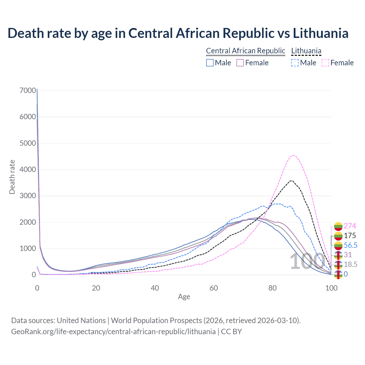 In the Central African Republic, the most common age of death is 0, compared to 86 in Lithuania. The median age of death is 65.2 in the Central African Republic and 80.4 in Lithuania, meaning only half of each cohort is expected to live past that age.