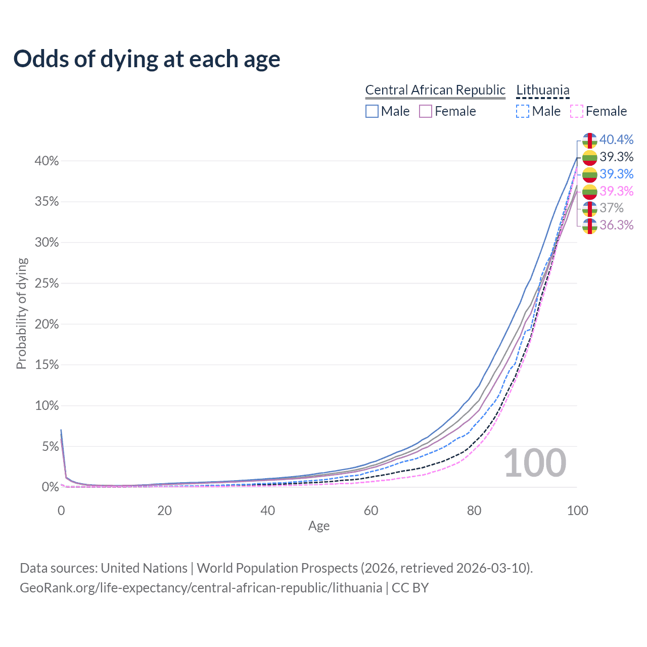 This life expectancy calculator shows the odds of living to 100, 95, 90, and below based on current age for both males and females in the Central African Republic and Lithuania, along with mean and median age of death. The calculations are based on the 2026 life tables (actuarial tables) from the UN World Population Prospects.