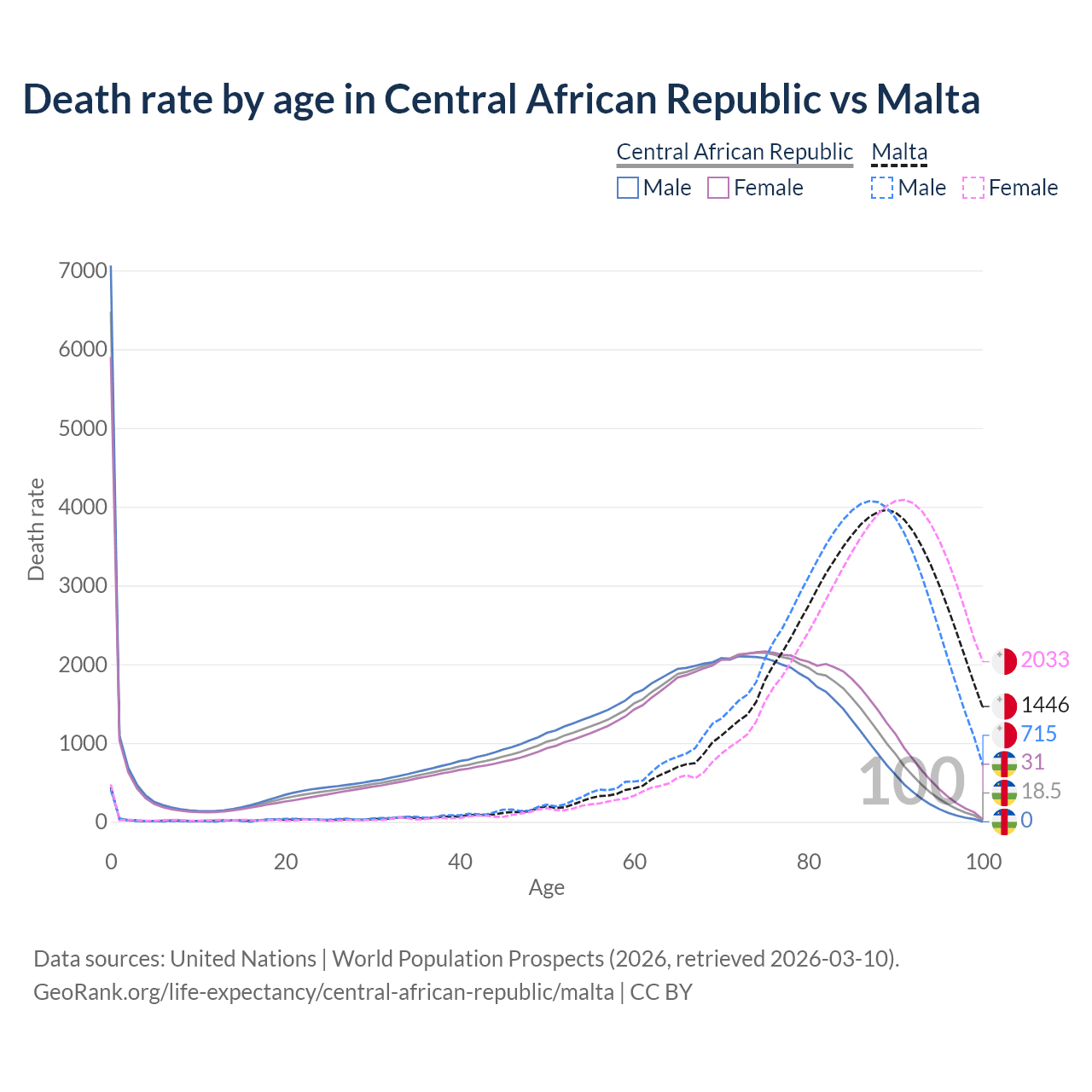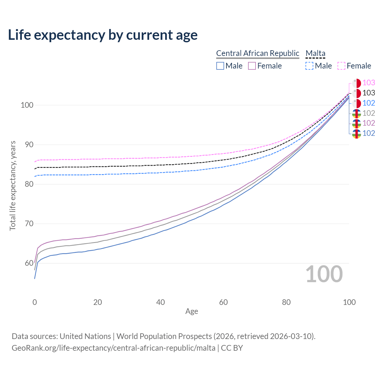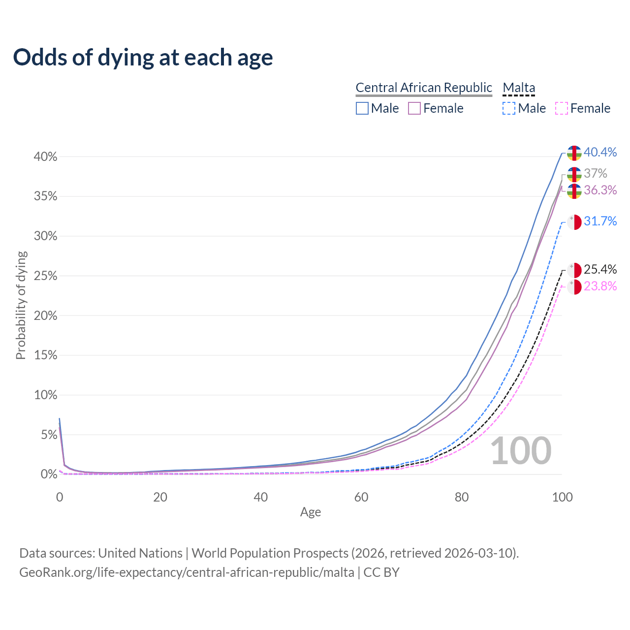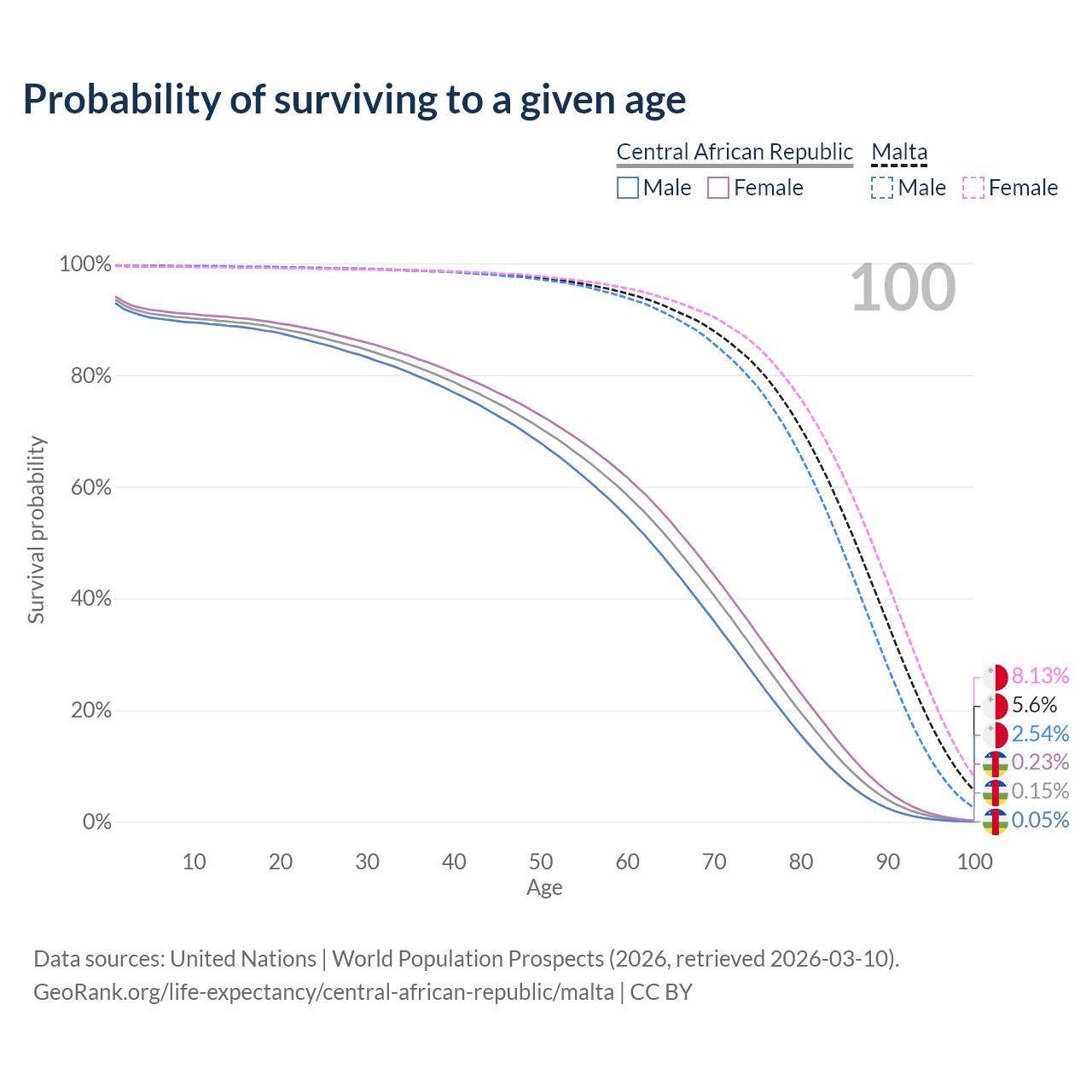This life expectancy calculator shows the odds of living to 100, 95, 90, and below based on current age for both males and females in the Central African Republic and Malta, along with mean and median age of death. The calculations are based on the 2026 life tables (actuarial tables) from the UN World Population Prospects.