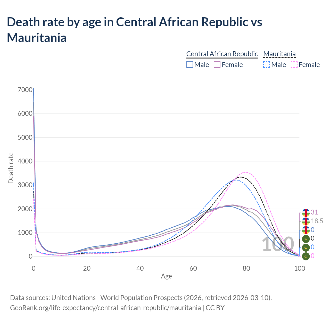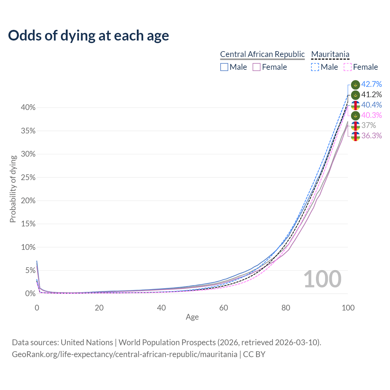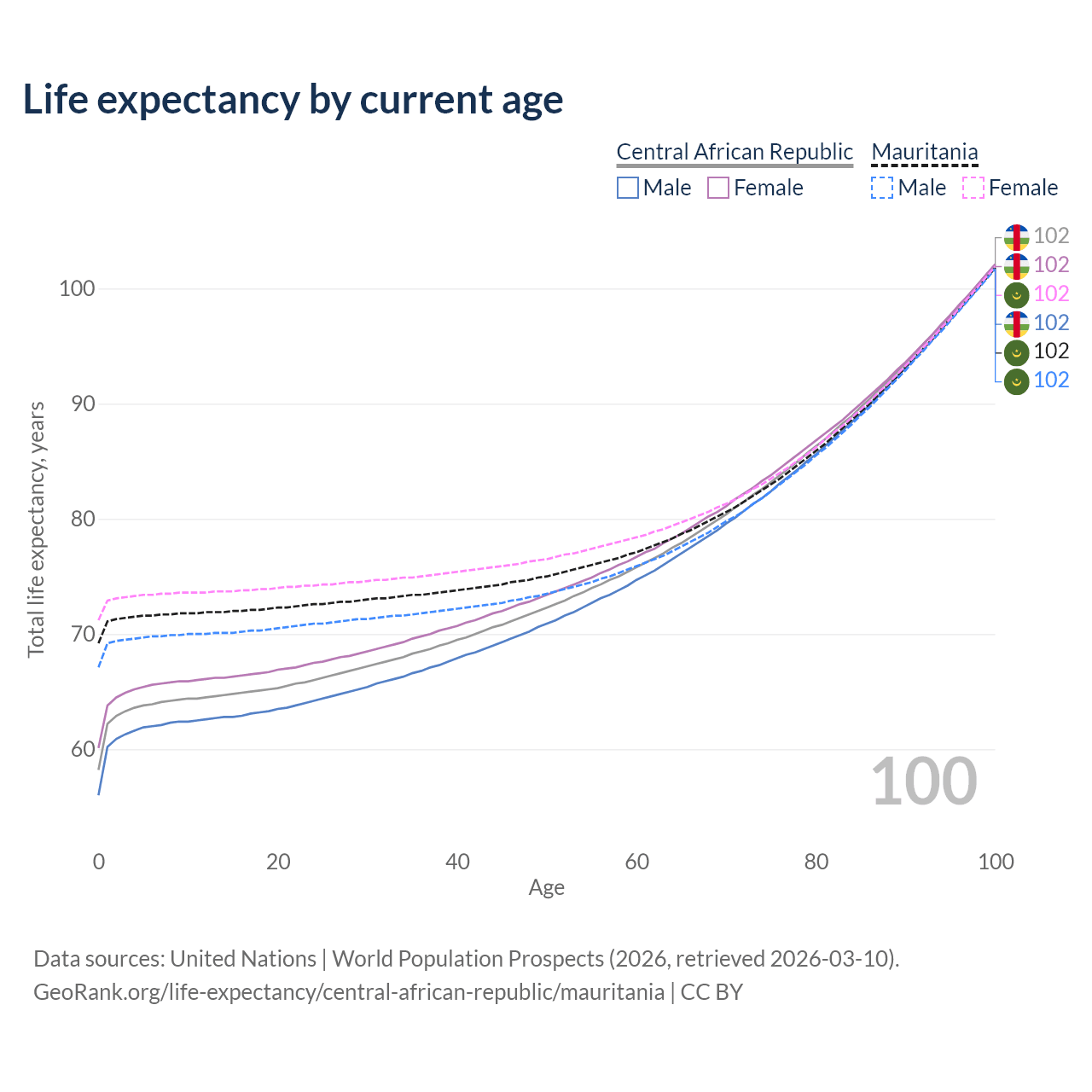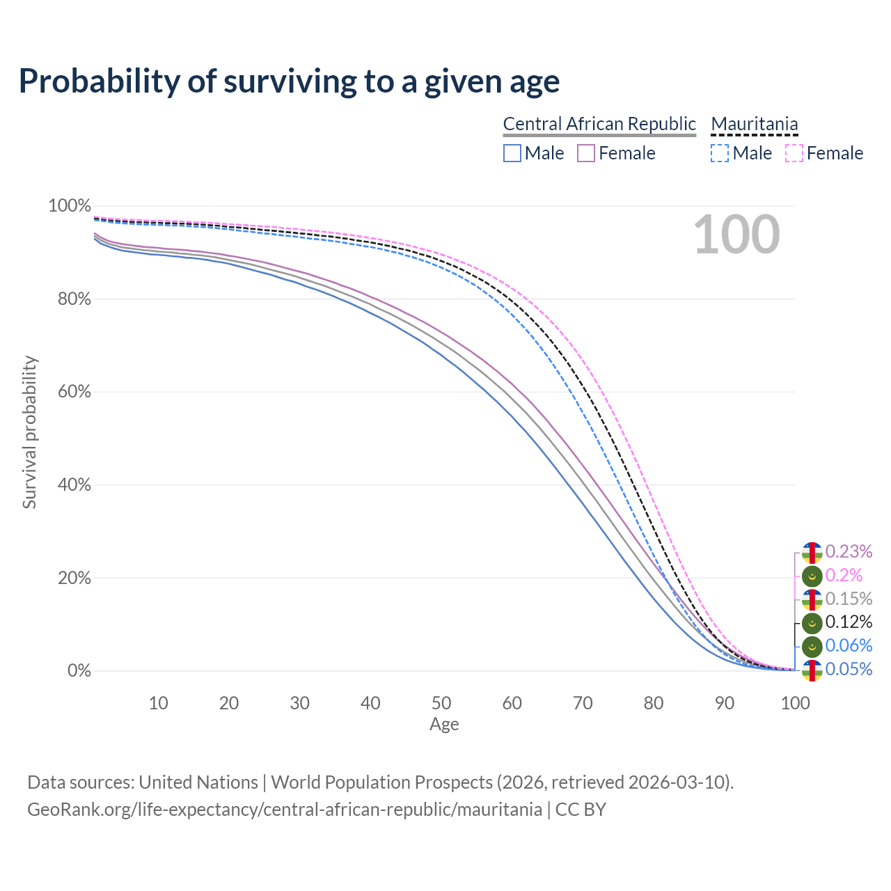 This life expectancy calculator shows the odds of living to 100, 95, 90, and below based on current age for both males and females in the Central African Republic and Mauritania, along with mean and median age of death. The calculations are based on the 2026 life tables (actuarial tables) from the UN World Population Prospects.