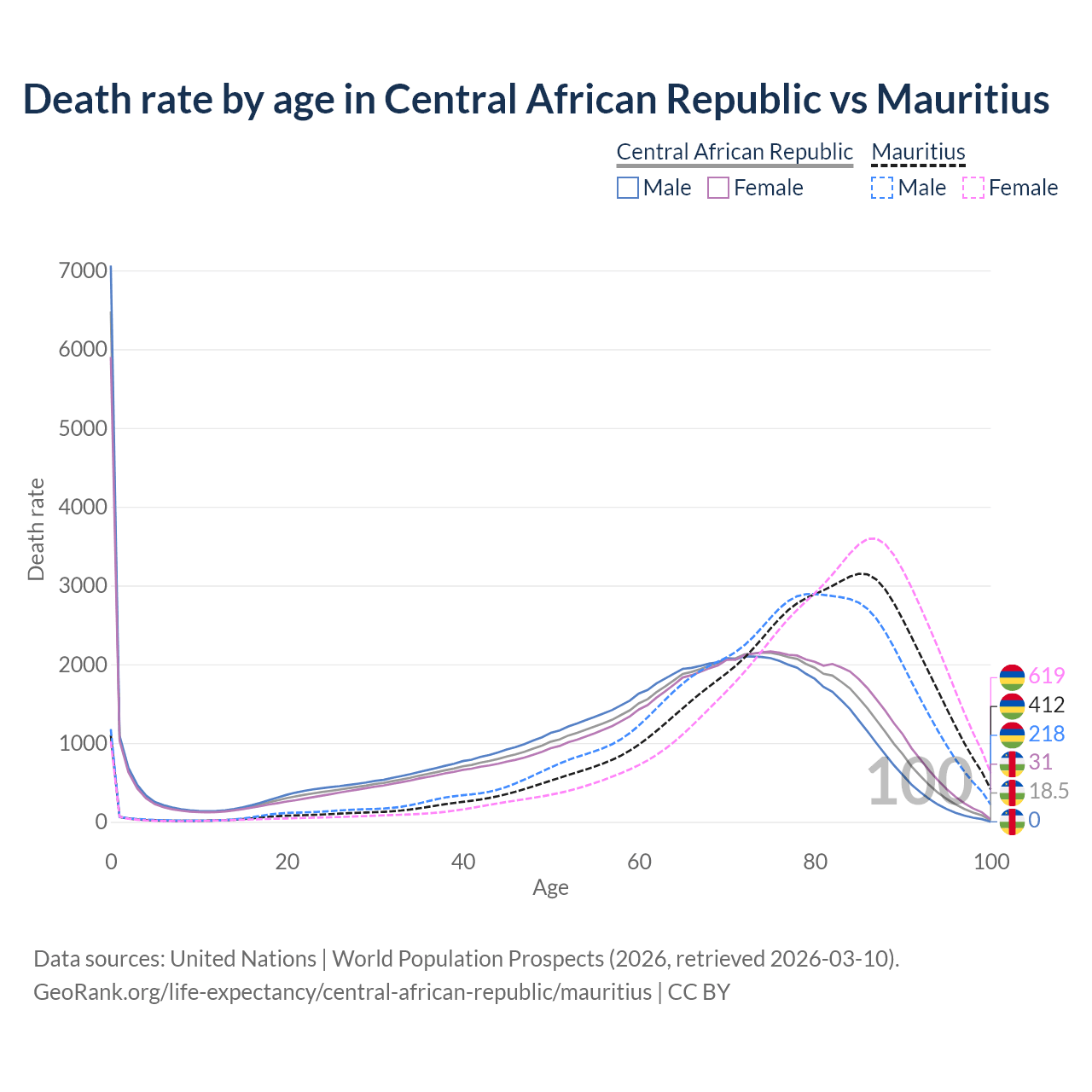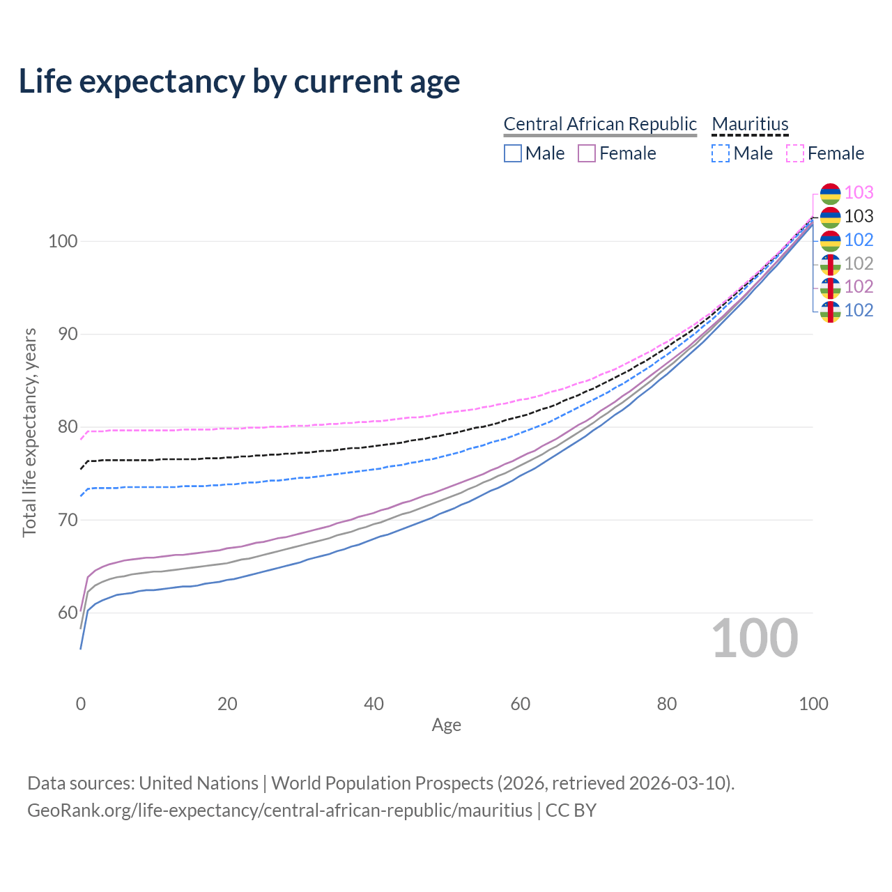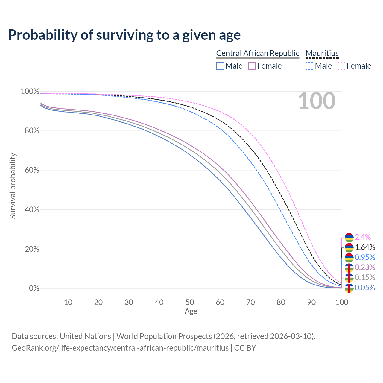 This life expectancy calculator shows the odds of living to 100, 95, 90, and below based on current age for both males and females in the Central African Republic and Mauritius, along with mean and median age of death. The calculations are based on the 2026 life tables (actuarial tables) from the UN World Population Prospects.