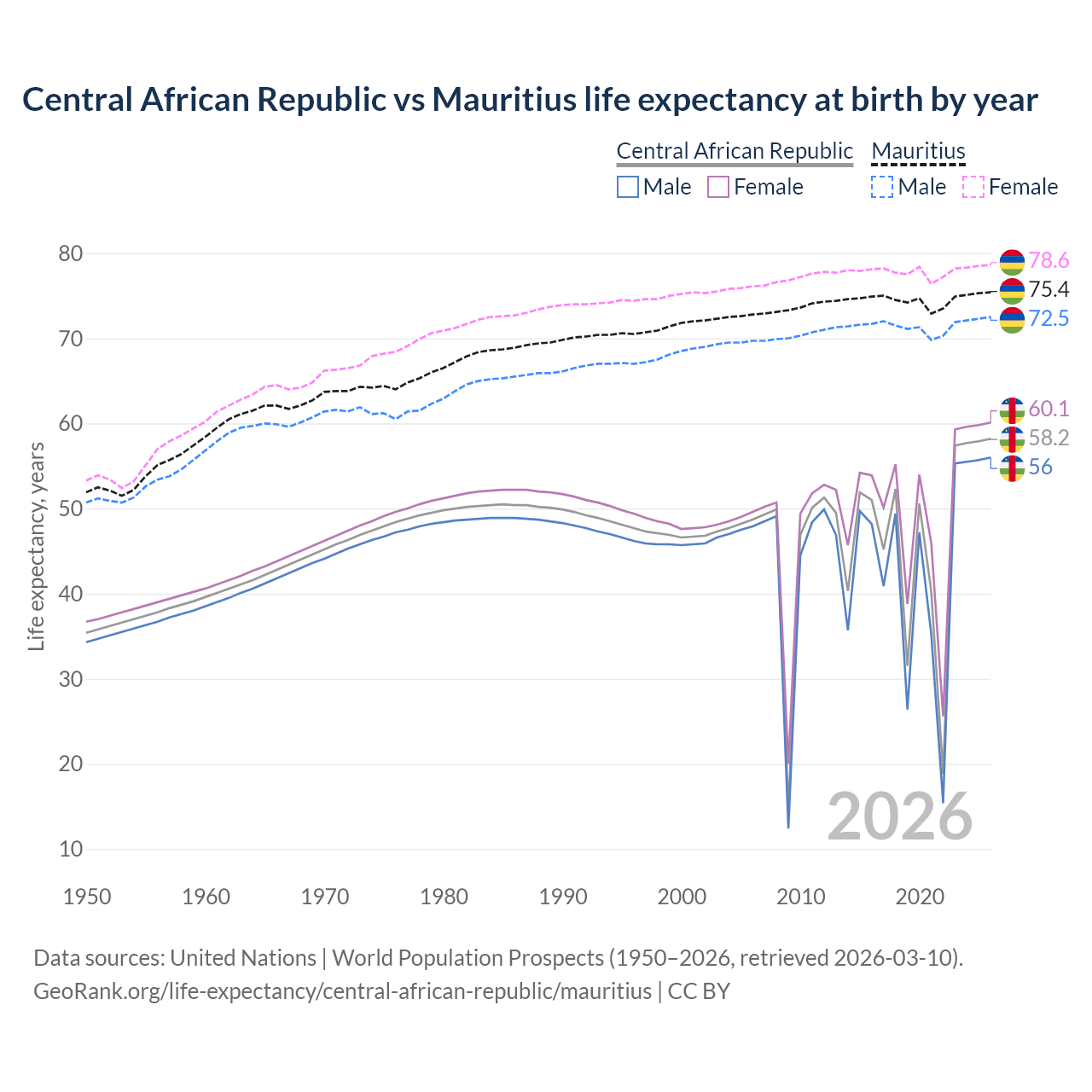 GeoRank.org/life-expectancy/central-african-republic/mauritius | CC BY