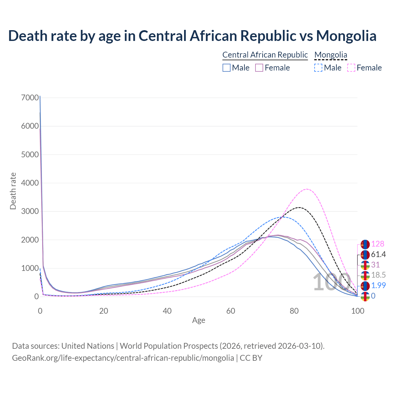 In the Central African Republic, the most common age of death is 0, compared to 82 in Mongolia. The median age of death is 65.2 in the Central African Republic and 76 in Mongolia, meaning only half of each cohort is expected to live past that age.