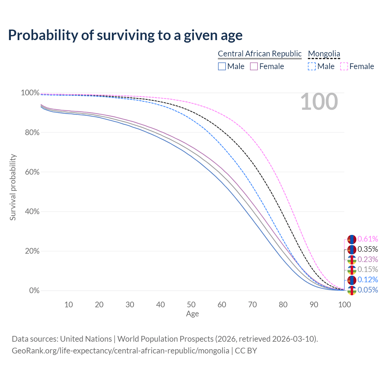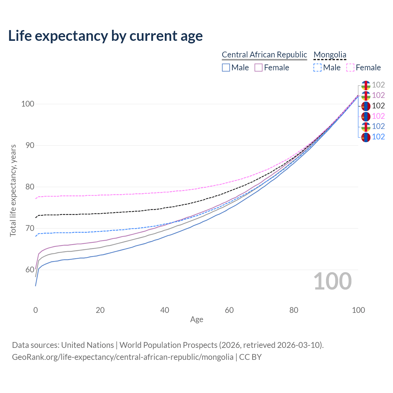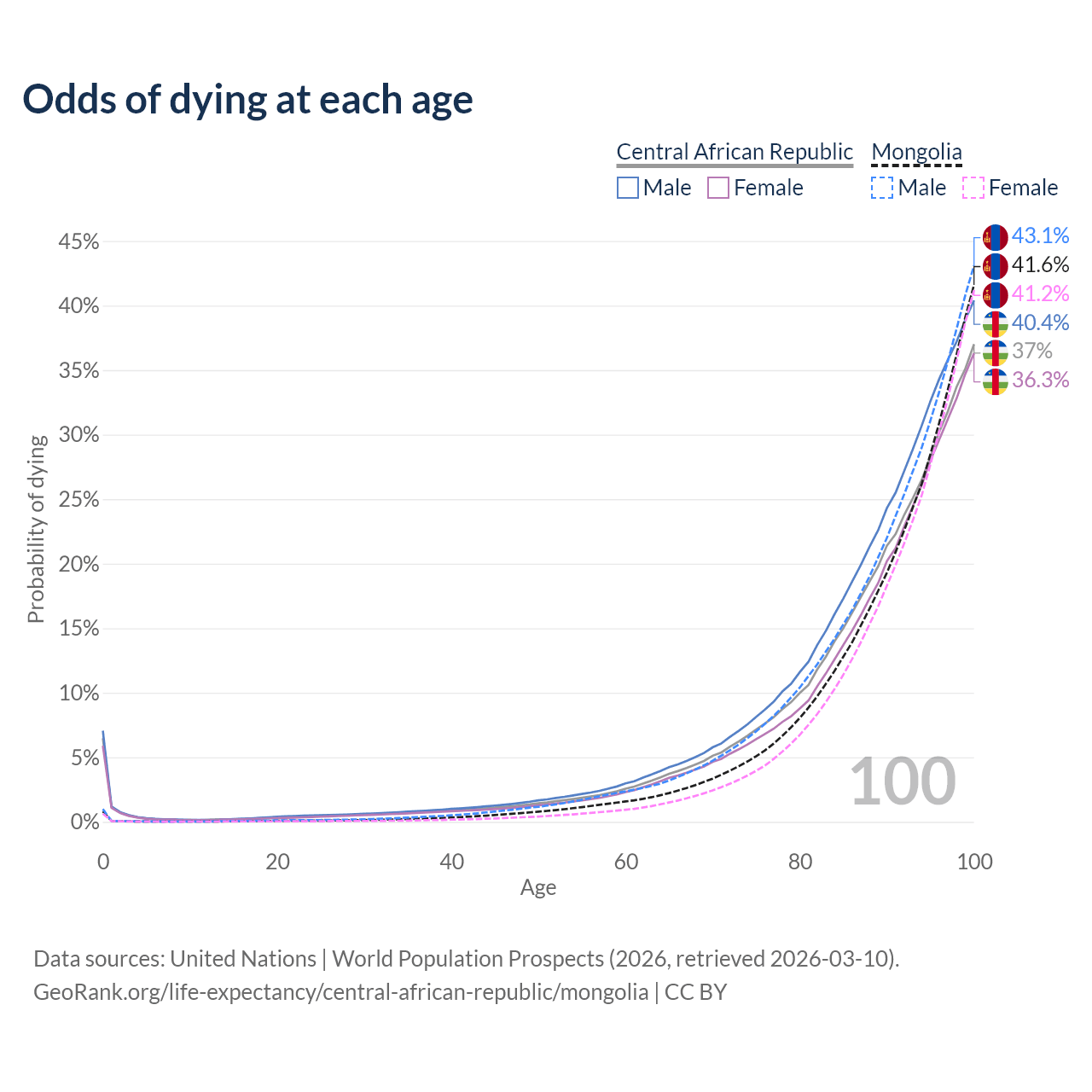 This life expectancy calculator shows the odds of living to 100, 95, 90, and below based on current age for both males and females in the Central African Republic and Mongolia, along with mean and median age of death. The calculations are based on the 2026 life tables (actuarial tables) from the UN World Population Prospects.