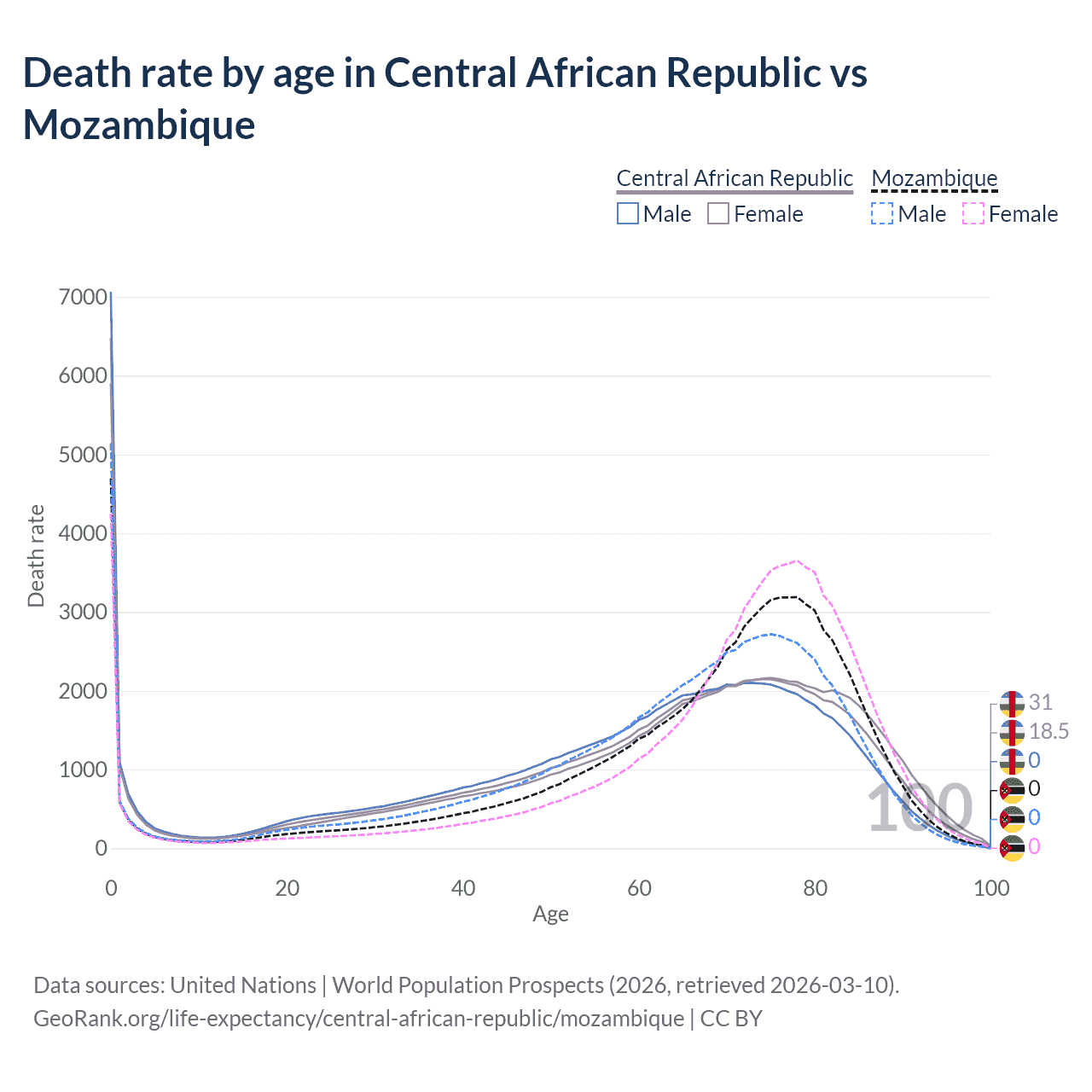 In the Central African Republic, the most common age of death is 0, compared to 0 in Mozambique. The median age of death is 65.2 in the Central African Republic and 71.2 in Mozambique, meaning only half of each cohort is expected to live past that age.