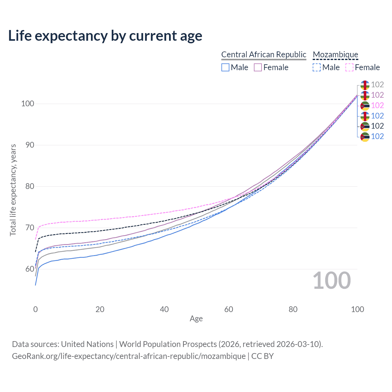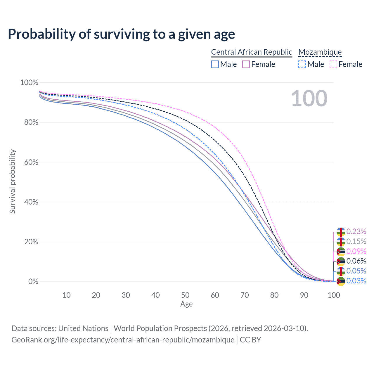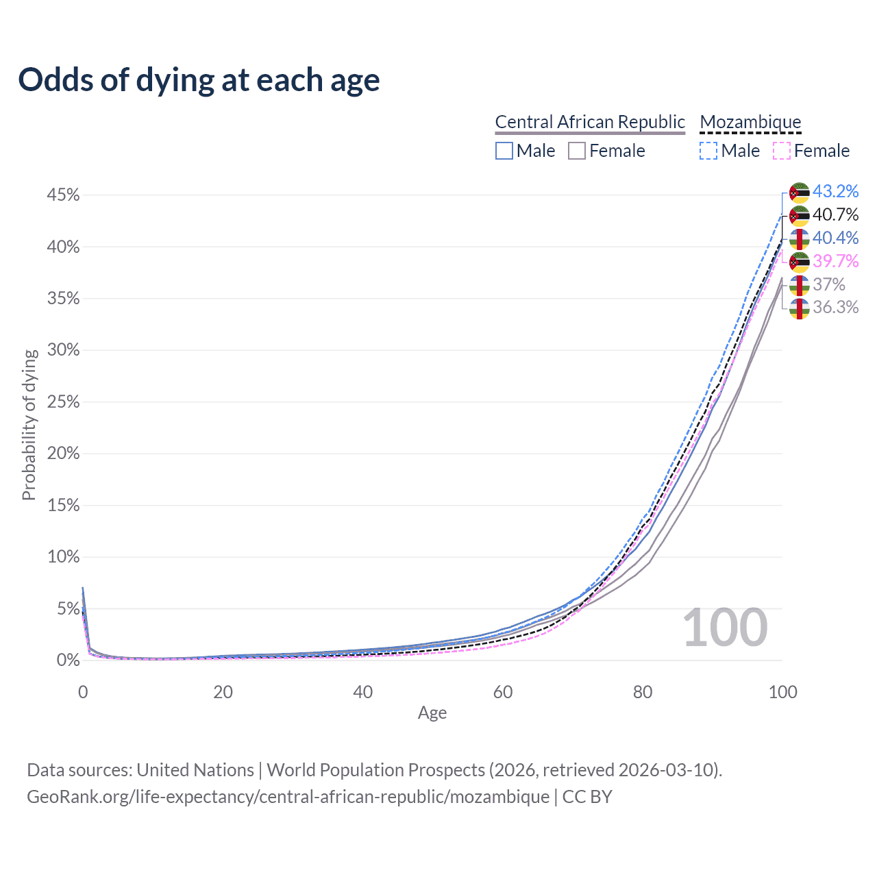 This life expectancy calculator shows the odds of living to 100, 95, 90, and below based on current age for both males and females in the Central African Republic and Mozambique, along with mean and median age of death. The calculations are based on the 2026 life tables (actuarial tables) from the UN World Population Prospects.