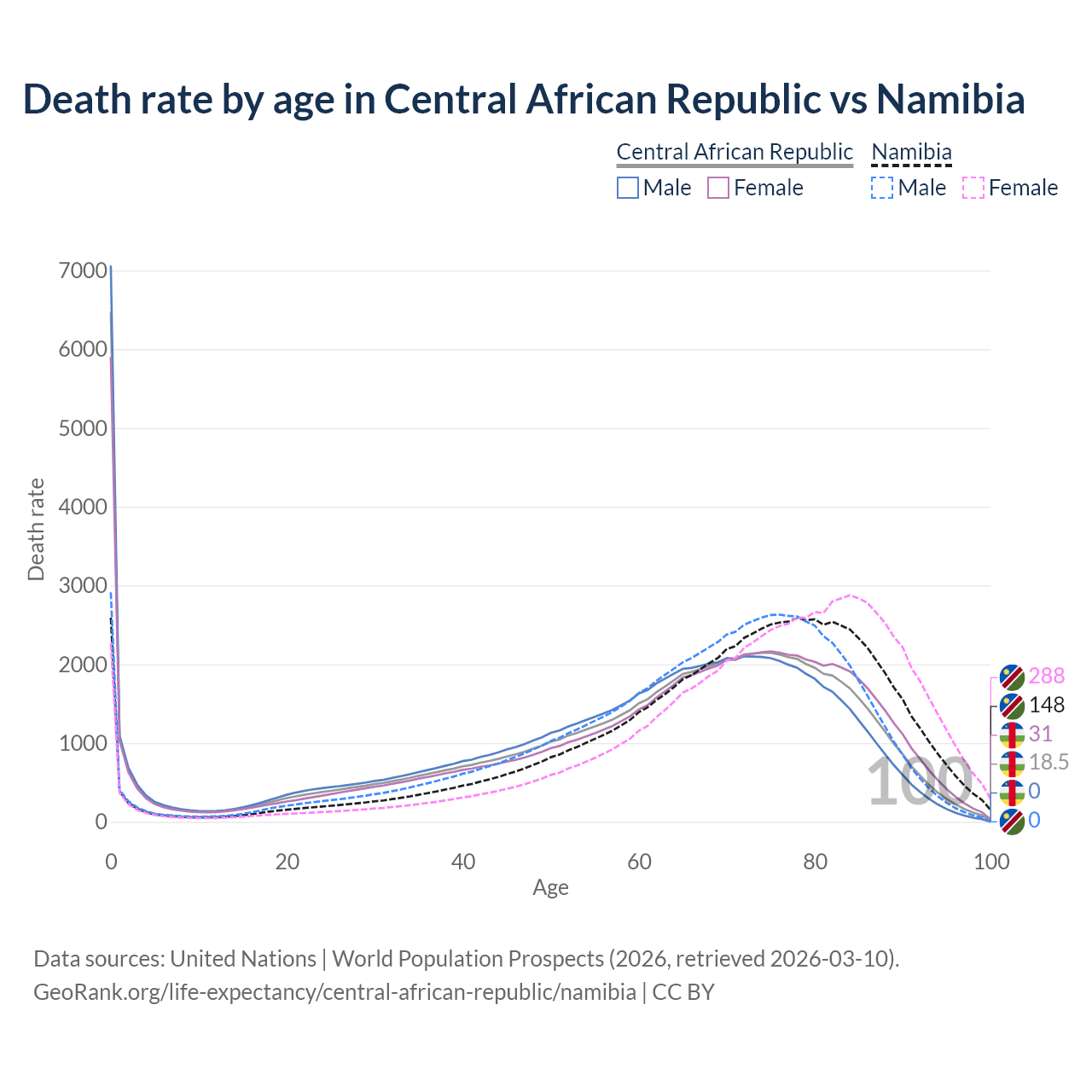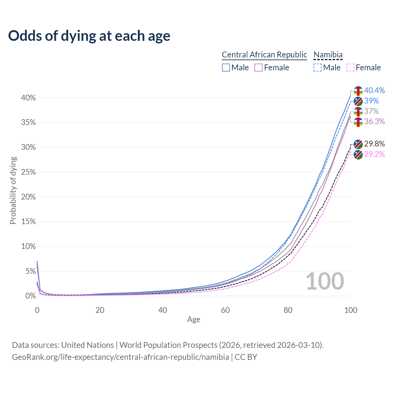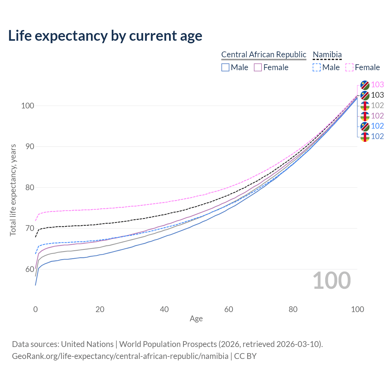 This life expectancy calculator shows the odds of living to 100, 95, 90, and below based on current age for both males and females in the Central African Republic and Namibia, along with mean and median age of death. The calculations are based on the 2026 life tables (actuarial tables) from the UN World Population Prospects.