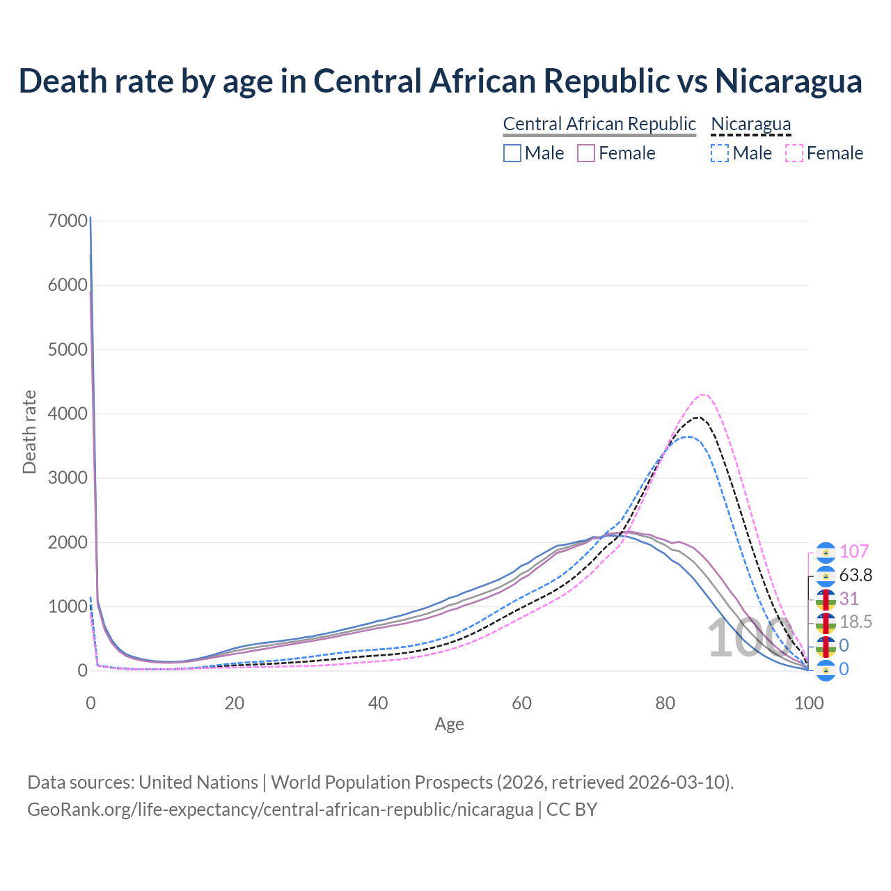 In the Central African Republic, the most common age of death is 0, compared to 85 in Nicaragua. The median age of death is 65.2 in the Central African Republic and 79.9 in Nicaragua, meaning only half of each cohort is expected to live past that age.